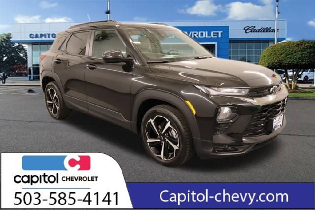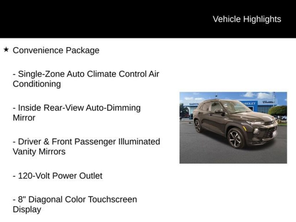 CARFAX One-Owner. Clean CARFAX. 1 Type-A & 1 Type-C USB Charging-Only Ports, 120-Volt Power Outlet, 8 Diagonal Color Touchscreen Display, Convenience Package, Driver & Front Passenger Illuminated Vanity Mirrors, Driver Confidence Package, Inside Rear-View Auto-Dimming Mirror, Lane Change Alert w/Side Blind Zone Alert, Rear Cross Traffic Alert, Rear Park Assist, Single-Zone Auto Climate Control Air Conditioning. Priced below KBB Fair Purchase Price! Odometer is 6829 miles below market average! 29/33 City/Highway MPGWe Buy cars- Fast, Fair and Easy This 2023 Mosaic Black Metallic Chevrolet TrailBlazer RS FWD is well equipped and includes these features and benefits: Convenience Package (1 Type-A & 1 Type-C USB Charging-Only Ports, 120-Volt Power Outlet, 8 Diagonal Color Touchscreen Display, Driver & Front Passenger Illuminated Vanity Mirrors, Inside Rear-View Auto-Dimming Mirror, Single-Zone Auto Climate Control Air Conditioning, and Cabin Humidity Sensor), Driver Confidence Package (Lane Change Alert w/Side Blind Zone Alert, Rear Cross Traffic Alert, and Rear Park Assist), Preferred Equipment Group 1RS (Heated Steering Wheel), 2-Way Adjustable Front Head Restraints, 2-Way Power Driver Lumbar Seat Adjuster, 4-Way Manual Front Passenger Seat Adjuster, 4-Wheel Disc Brakes, 5.45 Axle Ratio, 6 Speakers, 6-Speaker Audio System Feature, 7 Diagonal Color Touchscreen, 8-Way Power Driver Seat Adjuster, ABS brakes, Air Conditioning, Alloy wheels, AM/FM radio: SiriusXM, Auto High-beam Headlights, Brake assist, Bumpers: body-color, Cargo Mat, Cloth w/Leatherette Seat Trim, Compass, Delay-off headlights, Driver door bin, Driver vanity mirror, Dual front impact airbags, Dual front side impact airbags, Electronic Stability Control, Emergency communication system: OnStar and Chevrolet connected services capable, Exterior Parking Camera Rear, Flat-Folding Front Passenger Seatback, Front & Rear All-Weather Floor Liners (LPO), Front anti-roll bar, Front Bucket Seats, Front Center Armrest, Front fog lights, Front License Plate Bracket, Front reading lights, Front wheel independent suspension, Fully automatic headlights, Heated door mirrors, Heated Driver & Front Passenger Seats, Heated front seats, Heated steering wheel, Illuminated entry, Knee airbag, Leather Shift Knob, Leather steering wheel, Low tire pressure warning, Mosaic Black Metallic Roof, Not Equipped w/Rear Park Assist (060), Occupant sensing airbag, Overhead airbag, Overhead console, Panic alarm, Passenger door bin, Passenger vanity mirror, Power door mirrors, Power driver seat, Power steering, Power windows, Radio data system, Radio: Chevrolet Infotainment 3 System, Rear seat center armrest, Rear side impact airbag, Rear window defroster, Rear window wiper, Remote keyless entry, Ride & Handling Suspension, Security system, SiriusXM Radio, Speed control, Split folding rear seat, Spoiler, Steering wheel mounted audio controls, Tachometer, Telescoping steering wheel, Tilt steering wheel, Traction control, Trip computer, Variably intermittent wipers, Wheels: 18 High Gloss Black Machined Aluminum, and Wireless Apple CarPlay/Android Auto.