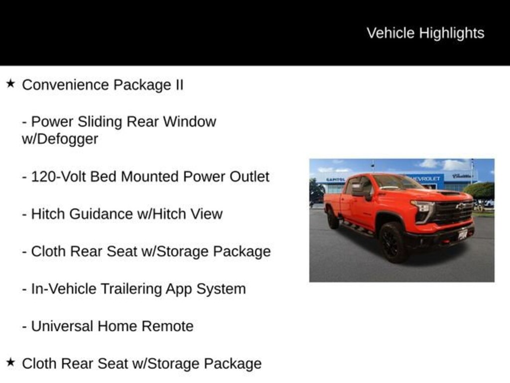 We Buy cars- Fast, Fair and Easy This 2025 Red Hot Chevrolet Silverado 3500HD LT 4WD is well equipped and includes these features and benefits: Cloth Rear Seat w/Storage Package, Convenience Package II (120-Volt Bed Mounted Power Outlet, Hitch Guidance w/Hitch View, In-Vehicle Trailering App System, Power Sliding Rear Window w/Defogger, and Universal Home Remote), Convenience Package (10-Way Power Driver Seat Adjuster w/Lumbar, Dual-Zone Automatic Climate Control, Front LED Fog Lamps, LED Cargo Area Lighting, and Manual Tilt-Wheel/Telescoping Steering Column), Heat Package (Heated Driver & Front Outboard Passenger Seats and Heated Steering Wheel), Leather Package, Preferred Equipment Group 1LT (170 Amp Alternator, 2-Speed Electronic Shift Transfer Case, 4-Way Manual Driver Seat Adjuster, Black Mirror Caps, Bluetooth® For Phone, Chevrolet Connected Access Capable, Color-Keyed Carpeting Floor Covering, Compass Located In Instrument Cluster, Deep-Tinted Glass, EZ Lift Power Lock & Release Tailgate, Front Rubberized Vinyl Floor Mats, Halogen Reflector Headlamps, HD Rear Vision Camera, Keyless Open & Start, OnStar Services Capable, Outside Power-Adjustable Mirrors, Power Door Locks, Power Front Windows w/Driver Express Up/Down, Power Front Windows w/Passenger Express Down, Power Rear Windows w/Express Down, Push Button Start, Rear 60/40 Folding Bench Seat (Folds Up), Rear Rubberized-Vinyl Floor Mats, SiriusXM w/360L Trial Subscription, Standard Tailgate, Steering Wheel Audio Controls, Steering Wheel Mounted Electronic Cruise Control, Wi-Fi Hotspot Capable, and Wrapped Steering Wheel), Remote Start Package (Electric Rear-Window Defogger, Remote Vehicle Starter System, and Unauthorized Entry Theft-Deterrent System), Safety Package (Bed View Camera w/2 Trailer Camera Provisions, HD Surround Vision, Rear Cross Traffic Alert, Trailer Camera Provisions, Trailer Side Blind Zone Alert, and Ultrasonic Front & Rear Park Assist), Suspension Package, Up-Level Rear Seat w/Storage Package, 120-Volt Interior Power Outlet, 2-Speed Active Transfer Case, 220 Amp Alternator, 3.42 Rear Axle Ratio, 3.73 Rear Axle Ratio, 4-Way Manual Passenger Seat Adjuster, 4-Wheel Disc Brakes, 4 Round Black Assist Steps (LPO), 6 Speakers, 6-Speaker Audio System Feature, ABS brakes, Air Conditioning, AM/FM radio: SiriusXM with 360L, Apple CarPlay/Android Auto, Auto High-beam Headlights, Auto-Dimming Inside Rear-View Mirror, Brake assist, Bumpers: chrome, Chevytec Spray-On Black Bedliner, Cloth Seat Trim, Compass, Delay-off headlights, Driver door bin, Driver vanity mirror, Dual front impact airbags, Dual front side impact airbags, Durabed Pickup Bed, Electronic Stability Control, Engine Block Heater, Exhaust Brake, Front 40/20/40 Split-Bench Seats w/Lockable Storage, Front anti-roll bar, Front Center Armrest w/Storage, Front License Plate Kit, Front reading lights, Front wheel independent suspension, Fully automatic headlights, Heated door mirrors, Heavy-Duty 80 Amp-Hr Battery, Illuminated entry, Low tire pressure warning, Occupant sensing airbag, Outside t