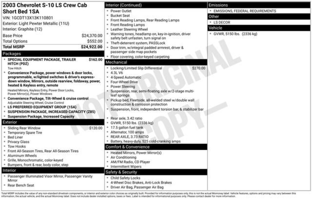 Recent Arrival! Clean CARFAX.We Buy cars- Fast, Fair and Easy This 2003 Light Pewter Metallic Chevrolet S-10 LS 4WD is well equipped and includes these features and benefits: Convenience Package, Increased Capacity Suspension Package, Power Convenience Package, Preferred Equipment Group 1SA (2 Front Frame-Mounted Recovery Hooks, Black Leather-Wrapped Steering Wheel Rim, Body-Colored Front & Rear Bumpers, Color-Keyed Carpeted Floor Covering, Fleetside Pickup Bed, Front Manual Air Conditioning, LS Decor, Solar-Ray Deep Tinted Glass, and Tachometer), 15 x 7 Cast Aluminum Wheels, 4 Speakers, 4-Wheel Disc Brakes, ABS brakes, Air Conditioning, Alloy wheels, AM/FM radio, Bumpers: body-color, CD player, Compass, Deluxe Cloth Seat Trim, Driver door bin, Driver vanity mirror, Dual front impact airbags, Front anti-roll bar, Front Bucket Seats, Front Center Armrest, Front High-Back Reclining Bucket Seats, Front reading lights, Front wheel independent suspension, Fully automatic headlights, Heated door mirrors, Heavy-Duty Rear Locking Differential, Illuminated entry, Leather steering wheel, Outside temperature display, Overhead console, Panic alarm, Passenger door bin, Passenger vanity mirror, Power door mirrors, Power steering, Power windows, Radio data system, Rear reading lights, Rear step bumper, Remote keyless entry, Sliding Rear Window, Speed control, Speed-sensing steering, Tilt steering wheel, Trailer Hitch, Variably intermittent wipers, and Voltmeter.