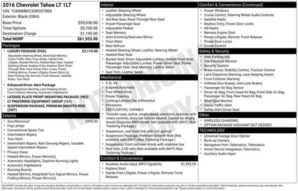 No Payments for 120 days on any New 2025 vehicle only at Capitol Auto Group- with finance terms up to 84 months!! Or any 2023 model or older pre-owned vehicle only at Capitol Auto Group- with finance terms up to 84 months!! Must be a MAPS credit union member to qualify. With an Experian score of 696 or higher. Effective 12-4-2025 through 1-15-2026 See dealer for more qualifying details. Recent Arrival! Odometer is 2314 miles below market average!Awards:* JD Power Initial Quality Study, JD Power APEAL Study * 2016 KBB.com 16 Best Family Cars * 2016 KBB.com Best Buy Awards * 2016 KBB.com Best Resale Value Awards * 2016 KBB.com Best Buy Awards FinalistWe Buy cars- Fast, Fair and Easy This 2016 Black Chevrolet Tahoe LT 4WD is well equipped and includes these features and benefits: License Plate Front Mounting Package, Luxury Package (2nd Row Pwr Release 60/40 Split Folding Bench Seat, 3rd Row 60/40 Power Fold Split-Bench, Extended-Range Remote Keyless Entry, Fog Lamps, Front & Rear Parking Assist, Hands Free Power Liftgate, Heated 2nd Row Seats, Heated Leather Wrapped Steering Wheel, Memory Settings, Passive Entry System, Power Tilt & Telescopic Steering Column w/Memory, Power-Folding Heated Outside Mirrors, Push Button Keyless Start, Rear Cross-Traffic Alert, Side Blind Zone Alert w/Lane Change Alert, and Wireless Charging), Preferred Equipment Group 1LT (1st & 2nd Row Color-Keyed Carpeted Floor Mats, 2nd Row 60/40 Split-Folding Manual Bench, 3rd Row Manual 60/40 Split-Folding Fold Flat Bench, 4-Wheel Antilock Disc Brakes, 5 12-Volt Auxiliary Power Outlets, Auto-Dimming Inside Rear-View Mirror, Black Assist Steps, Bose Premium 9-Speaker System, Color-Keyed Carpeting Floor Covering, Driver Inboard & Front Passenger Airbags, Electronic Cruise Control w/Set & Resume Speed, Enhanced Driver Instrument Information Display, Floor Console, Leather-Wrapped Steering Wheel, OnStar Basic Plan For 5 Years, Power Liftgate, Power-Adjustable Accelerator & Brake Pedals, Rear Park Assist w/Audible Warning, Roof-Mounted Luggage Rack Side Rails, SiriusXM Satellite Radio, and Universal Home Remote), Premium Smooth Ride Suspension Package, 18 x 8.5 Aluminum Wheels, 3.08 Rear Axle Ratio, 3rd row seats: split-bench, 4-Wheel Disc Brakes, 6-Way Power Front Passenger Seat Adjuster, 9 Speakers, ABS brakes, Adjustable pedals, Air Conditioning, Alloy wheels, AM/FM radio: SiriusXM, Apple CarPlay, Auto High-beam Headlights, Auto-dimming Rear-View mirror, Automatic temperature control, Brake assist, Bumpers: body-color, CD player, Compass, Delay-off headlights, Driver door bin, Driver vanity mirror, Dual front impact airbags, Dual front side impact airbags, Electronic Stability Control, Emergency communication system: OnStar, Exterior Parking Camera Rear, Forward Collision Alert Sensor Indicator, Front anti-roll bar, Front Bucket Seats, Front Center Armrest, Front dual zone A/C, Front Heated Reclining Bucket Seats, Front reading lights, Front wheel independent suspension, Fully automatic headlights, Garage door transmitter, Heated door mirrors, Heated front seats, Illuminated entry, IntelliBeam Headlamps, Lane Departure Warning System, Lane Keep Assist, Leather-Appointed Seat Trim, Low tire pressure warning, Memory seat, Occupant sensing airbag, Outside temperature display, Overhead airbag, Overhead console, Panic alarm, Passenger door bin, Passenger vanity mirror, Pedal memory, Power door mirrors, Power driver seat, Power passenger seat, Power steering, Power Sunroof, Power windows, Premium audio system: Chevrolet MyLink, Radio: Chevrolet MyLink AM/FM Stereo, Rain sensing wipers, Rear air conditioning, Rear anti-roll bar, Rear reading lights, Rear Seat Blu-Ray/DVD Entertainment System, Rear seat center armrest, Rear window defroster, Rear window wiper, Remote keyless entry, Roof rack: rails only, Safety Alert Driver Seat, Security system, Single-Slot CD/MP3 Player, Speed control, Speed-sensing steering, Split folding rear