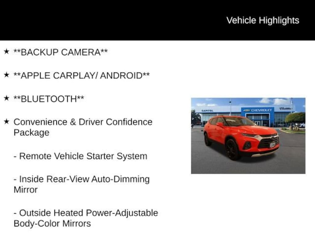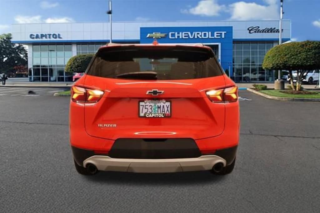 We Buy cars- Fast, Fair and Easy This 2019 Red Hot Chevrolet Blazer FWD is well equipped and includes these features and benefits: Convenience & Driver Confidence Package (Black Roof Rails, Heated Driver & Front Passenger Seats, Inside Rear-View Auto-Dimming Mirror, Lane Change Alert w/Side Blind Zone Alert, Outside Heated Power-Adjustable Body-Color Mirrors, Rear Cross Traffic Alert, Rear Park Assist w/Audible Warning, Rear Power Programmable Liftgate, Remote Vehicle Starter System, and Universal Home Remote), Interior Protection Package (LPO) (Premium All-Weather Cargo Mat (LPO) and Premium All-Weather Floor Mats), Preferred Equipment Group 1LT, 3.80 Final Drive Ratio, 4-Wheel Disc Brakes, 6 Speakers, 6-Speaker Audio System Feature, ABS brakes, Air Conditioning, Alloy wheels, AM/FM radio: SiriusXM, Apple CarPlay/Android Auto, Automatic temperature control, Brake assist, Bumpers: body-color, Child-Seat-Sensing Airbag, Compass, Delay-off headlights, Driver door bin, Driver vanity mirror, Dual front impact airbags, Dual front side impact airbags, Electronic Stability Control, Emergency communication system: OnStar and Chevrolet connected services capable, Four wheel independent suspension, Front & Rear Black Bowtie Emblems (LPO), Front anti-roll bar, Front Bucket Seats, Front Center Armrest, Front dual zone A/C, Front reading lights, Fully automatic headlights, Heated door mirrors, High-Intensity Discharge Headlights, Illuminated entry, Knee airbag, Leather Shift Knob, Low tire pressure warning, Occupant sensing airbag, Outside temperature display, Overhead airbag, Overhead console, Panic alarm, Passenger door bin, Passenger vanity mirror, Power door mirrors, Power driver seat, Power steering, Power windows, Premium Cloth Seat Trim, Radio data system, Radio: Chevrolet Infotainment 3 System, Rear anti-roll bar, Rear reading lights, Rear seat center armrest, Rear window defroster, Rear window wiper, Remote keyless entry, Ride & Handling Suspension, Security system, Speed control, Speed-sensing steering, Split folding rear seat, Spoiler, Steering wheel mounted audio controls, Tachometer, Telescoping steering wheel, Tilt steering wheel, Traction control, Trip computer, Variably intermittent wipers, Voltmeter, Wheels: 18 Bright Silver Aluminum, Wheels: 20 Gloss Black Aluminum (LPO), and Wheels: 20 Transit.