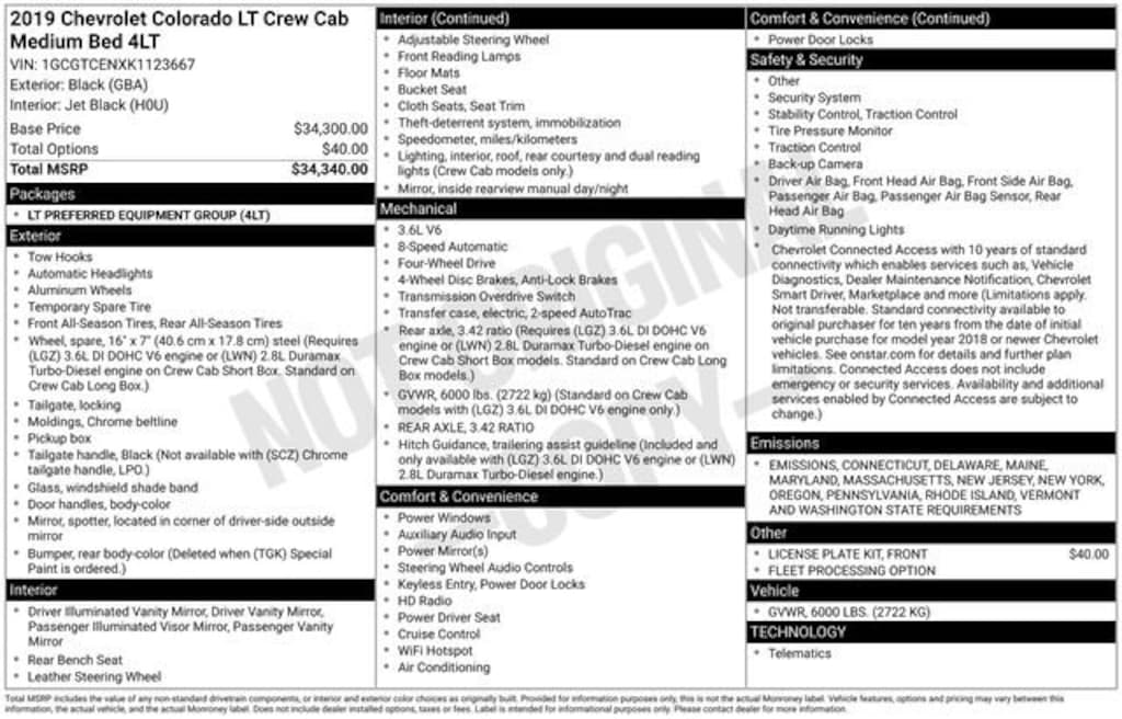 Odometer is 14025 miles below market average!Awards:* 2019 KBB.com Best Resale Value AwardsWe Buy cars- Fast, Fair and Easy This 2019 Black Chevrolet Colorado LT 4WD is well equipped and includes these features and benefits: Preferred Equipment Group 4LT, 3.42 Rear Axle Ratio, 4-Wheel Disc Brakes, 6 Speakers, 6-Speaker Audio System Feature, ABS brakes, Air Conditioning, Alloy wheels, AM/FM radio: SiriusXM, Apple CarPlay, Bumpers: body-color, Cloth Seat Trim, Compass, Delay-off headlights, Driver 6-Way Power Seat Adjuster, Driver door bin, Driver vanity mirror, Dual front impact airbags, Dual front side impact airbags, Electronic Stability Control, Exterior Parking Camera Rear, Front anti-roll bar, Front Bucket Seats, Front Center Armrest, Front License Plate Kit, Front reading lights, Front wheel independent suspension, Fully automatic headlights, HD Radio, Illuminated entry, Low tire pressure warning, Occupant sensing airbag, Outside temperature display, Overhead airbag, Overhead console, Panic alarm, Passenger door bin, Passenger vanity mirror, Power door mirrors, Power driver seat, Power steering, Power windows, Premium audio system: Chevrolet Infotainment System, Radio data system, Radio: Chevrolet Infotainment 3 Plus System, Rear reading lights, Rear seat center armrest, Rear step bumper, Remote keyless entry, Security system, SiriusXM Radio, Speed control, Speed-sensing steering, Steering wheel mounted audio controls, Tachometer, Telescoping steering wheel, Tilt steering wheel, Tow/Haul Mode, Traction control, Trip computer, Variably intermittent wipers, and Wheels: 17 x 8 Blade Silver Metallic Cast Alloy.
