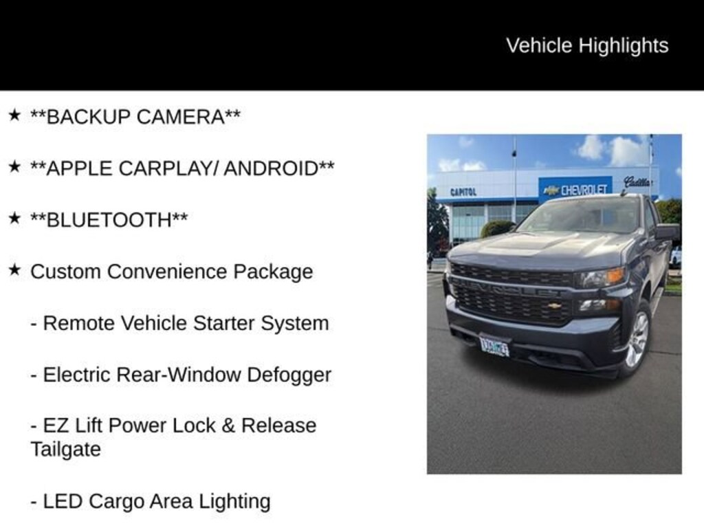 We Buy cars- Fast, Fair and Easy This 2020 Shadow Gray Metallic Chevrolet Silverado 1500 Custom 4WD is well equipped and includes these features and benefits: Custom Convenience Package (Electric Rear-Window Defogger, EZ Lift Power Lock & Release Tailgate, LED Cargo Area Lighting, Remote Vehicle Starter System, and Theft Deterrent System (Unauthorized Entry)), Custom Value Package, Infotainment Package (4G LTE Wi-Fi Hot Spot Capable, Chevrolet Connected Access Capable, Compass, OnStar & Chevrolet Connected Services Capable, and SiriusXM Radio), Trailering Package (Hitch Guidance), Preferred Equipment Group 1CX (170 Amps Alternator, 3.5 Diagonal Monochromatic Display, Bluetooth® For Phone, Body Color Grille, Color-Keyed Carpeting Floor Covering, Deep-Tinted Glass, Front Frame-Mounted Black Recovery Hooks, Front Rubberized Vinyl Floor Mats, Locking Tailgate, Manual Tilt-Wheel Steering Column, Power Door Locks, Power Front Windows w/Driver Express Up/Down, Power Front Windows w/Passenger Express Down, Power Rear Windows w/Express Down, Rear 60/40 Folding Bench Seat (Folds Up), Rear Rubberized-Vinyl Floor Mats, Remote Keyless Entry, and Steering Wheel Mounted Electronic Cruise Control), 3.42 Rear Axle Ratio, 4-Wheel Disc Brakes, 6 Speakers, ABS brakes, Air Conditioning, Alloy wheels, Apple CarPlay/Android Auto, Brake assist, Bumpers: body-color, Cloth Seat Trim, Delay-off headlights, Driver door bin, Driver vanity mirror, Dual front impact airbags, Dual front side impact airbags, Electronic Stability Control, Exterior Parking Camera Rear, Front 40/20/40 Split-Bench Seat, Front anti-roll bar, Front Black Bowtie Emblem (LPO), Front Center Armrest, Front License Plate Kit, Front reading lights, Front wheel independent suspension, Fully automatic headlights, Heated door mirrors, Heavy Duty Suspension, Heavy-Duty Rear Locking Differential, Illuminated entry, Low tire pressure warning, Occupant sensing airbag, Outside temperature display, Overhead airbag, Overhead console, Panic alarm, Passenger door bin, Passenger vanity mirror, Polished Exhaust Tip, Power door mirrors, Power steering, Power windows, Radio data system, Radio: Chevrolet Infotainment 3 System, Rear reading lights, Rear step bumper, Remote keyless entry, Speed control, Speed-sensing steering, Split folding rear seat, Tachometer, Tilt steering wheel, Traction control, Trip computer, Variably intermittent wipers, Voltmeter, and Wheels: 20 x 9 Bright Silver Painted Aluminum.
