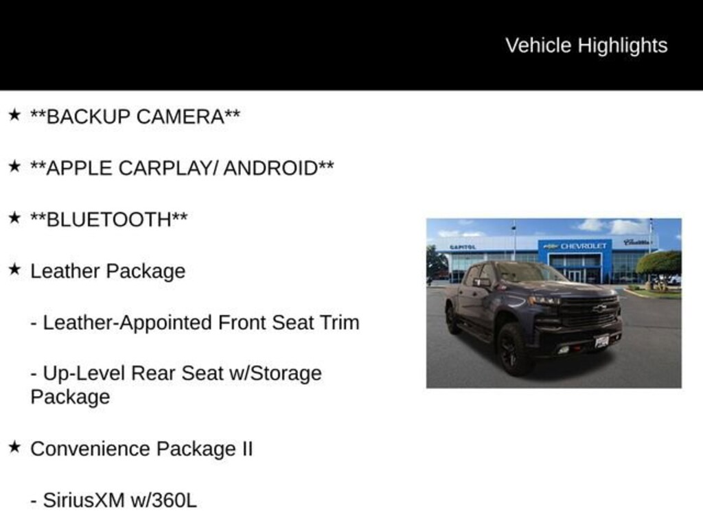 **BACKUP CAMERA**, **APPLE CARPLAY/ ANDROID**, **BLUETOOTH**, 120-Volt Instrument Panel Power Outlet, 2 USB Ports, Convenience Package II, HD Radio, HD Rear Vision Camera, Lane Change Alert w/Side Blind Zone Alert, Leather Package, Leather-Appointed Front Seat Trim, Perimeter Lighting, Power Sliding Rear Window w/Rear Defogger, Premium Bose 7-Speaker Sound System, Radio: Chevrolet Infotainment 3 Plus System, Rear Cross Traffic Alert, Safety Package, SiriusXM w/360L, Ultrasonic Front & Rear Park Assist, Universal Home Remote, Up-Level Rear Seat w/Storage Package, Wireless Phone Projection. Priced below KBB Fair Purchase Price! Odometer is 10917 miles below market average!We Buy cars- Fast, Fair and Easy This 2021 Blue Metallic Chevrolet Silverado 1500 LT Trail Boss 4WD is well equipped and includes these features and benefits: Convenience Package II (120-Volt Instrument Panel Power Outlet, 2 USB Ports, HD Radio, HD Rear Vision Camera, Power Sliding Rear Window w/Rear Defogger, Premium Bose 7-Speaker Sound System, Radio: Chevrolet Infotainment 3 Plus System, SiriusXM w/360L, Universal Home Remote, Wireless Phone Projection, and 120-Volt Bed Mounted Power Outlet), Leather Package (Leather-Appointed Front Seat Trim), Safety Package (Lane Change Alert w/Side Blind Zone Alert, Perimeter Lighting, Rear Cross Traffic Alert, and Ultrasonic Front & Rear Park Assist), Up-Level Rear Seat w/Storage Package, Bed Protection Package (Chevytec Spray-On Black Bedliner and Rear Wheelhouse Liners), Cloth Rear Seat w/Storage Package, Convenience Package w/Buckets Seats (10-Way Power Driver Seat w/Lumbar, Dual-Zone Automatic Climate Control, Floor Mounted Center Console, Heated Driver & Front Outboard Passenger Seats, Heated Steering Wheel, and Manual Tilt/Telescoping Steering Column), Preferred Equipment Group 2LT (12-Volt Rear Auxiliary Power Outlet, 170 Amp Alternator, 2 USB Ports (First Row), 4.2 Diagonal Color Display Driver Info Center, 4G LTE Wi-Fi Hot Spot Capable, 6-Speaker Audio System, All-Weather Floor Liner (LPO) (AAK), Auto-Locking Rear Differential, Auxiliary External Transmission Oil Cooler, Bluetooth® For Phone, Chevrolet Connected Access Capable, Color-Keyed Carpeting Floor Covering, Compass, Deep-Tinted Glass, Dual Exhaust w/Polished Outlets, Electric Rear-Window Defogger, Electrical Lock Control Steering Column, Electronic Cruise Control, EZ Lift Power Lock & Release Tailgate, Front LED Fog Lamps, High Gloss Black Grille, High Gloss Black Mirror Caps, Keyless Open & Start, Leather Wrapped Steering Wheel, LED Cargo Area Lighting, LED Reflector Headlamps, OnStar & Chevrolet Connected Services Capable, Performance Red Recovery Hooks, Power Door Locks, Power Front Windows w/Driver Express Up/Down, Power Front Windows w/Passenger Express Down, Power Rear Windows w/Express Down, Rear Dual USB Charging-Only Ports, Rear Vision Camera, Remote Vehicle Starter System, SiriusXM Radio, Standard Tailgate, Steering Wheel Audio Controls, and Theft Deterrent System (Unauthorized Entry)), Suspension Package (Heavy-Duty Air Filter and Hill Descent Control), Trailering Package (Hitch Guidance), 3.23 Rear Axle Ratio, 4-Wheel Disc Brakes, 6 Speakers, ABS brakes, Air Conditioning, Alloy wheels, AM/FM radio: SiriusXM, Apple CarPlay/Android Auto, Automatic temperature control, Brake assist, Cloth Seat Trim, Delay-off headlights, Driver door bin, Driver vanity mirror, Dual front impact airbags, Dual front side impact airbags, Electronic Stability Control, Engine Block Heater, Front anti-roll bar, Front Bucket Seats, Front Center Armrest w/Storage, Front dual zone A/C, Front fog lights, Front reading lights, Front wheel independent suspension, Fully automatic headlights, Heated door mirrors, Heated front seats, Heated steering wheel, Illuminated entry, Integrated Trailer Brake Controller, Low tire pressure warning, Occupant sensing airbag, Off-Road Suspension w/2 Lift, Outside temperature display, Overhead airbag, Overhead console, Panic al