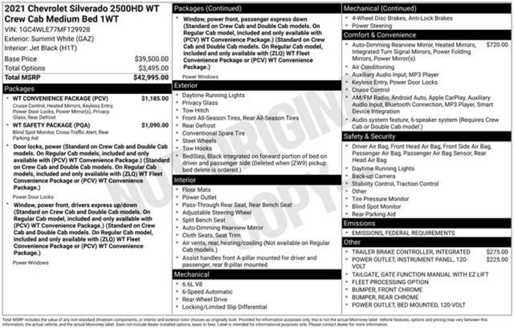 We Buy cars- Fast, Fair and Easy This 2021 Summit White Chevrolet Silverado 2500HD Work Truck RWD is well equipped and includes these features and benefits: Preferred Equipment Group 1WT (170 Amp Alternator, 3.5 Diagonal Monochromatic Display DIC, Black Front Bumper, Black Front Grille, Black Mirror Caps, Black Rear Bumper, Bluetooth® For Phone, High-Visibility Vertical Trailering Mirrors, Locking Tailgate, Manual Tailgate Function w/No EZ Lift, Manual Tilt-Wheel Steering Column, Power Rear Windows w/Express Down, Rear 60/40 Folding Bench Seat (Folds Up), Rubberized-Vinyl Floor Covering, and Solar Absorbing Tinted Glass), Suspension Package, WT Convenience Package (Deep-Tinted Glass, Electric Rear-Window Defogger, Electronic Cruise Control w/Set & Resume Speed, Manual Tailgate Function w/EZ Lift, and Remote Keyless Entry), WT Safety Package (Chrome Front Bumper, Chrome Rear Bumper, Lane Change Alert w/Side Blind Zone Alert, Rear Cross Traffic Alert, and Ultrasonic Front & Rear Park Assist), 120-Volt Bed Mounted Power Outlet, 120-Volt Instrument Panel Power Outlet, 3.73 Rear Axle Ratio, 4-Wheel Disc Brakes, 6 Speakers, 6-Speaker Audio System, 720 Cold-Cranking Amps Heavy-Duty Battery, ABS brakes, Air Conditioning, AM/FM radio, Apple CarPlay/Android Auto, Auto-Dimming Inside Rear-View Mirror, Brake assist, Delay-off headlights, Driver door bin, Dual front impact airbags, Dual front side impact airbags, Electronic Stability Control, Front 40/20/40 Split-Bench Seat w/Storage, Front anti-roll bar, Front Center Armrest w/Storage, Front reading lights, Front wheel independent suspension, Fully automatic headlights, Heated & Auto-Dimming Vertical Trailering Mirrors, Integrated Trailer Brake Controller, Low tire pressure warning, Occupant sensing airbag, Outside temperature display, Overhead airbag, Overhead console, Passenger door bin, Passenger vanity mirror, Power steering, Power windows, Premium audio system: Chevrolet Infotainment 3, Radio: Chevrolet Infotainment 3 System, Rear reading lights, Rear step bumper, Split folding rear seat, Tachometer, Tilt steering wheel, Traction control, Trip computer, Variably intermittent wipers, Vinyl Seat Trim, Voltmeter, and Wheels: 17 Silver Painted Steel.