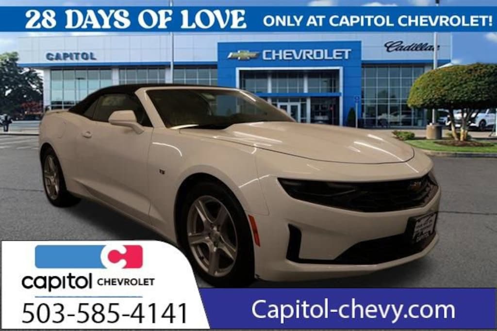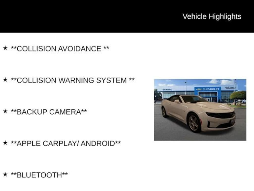We Buy cars- Fast, Fair and Easy This 2023 Summit White Chevrolet Camaro 1LT RWD is well equipped and includes these features and benefits: Preferred Equipment Group 1LT, 18 Silver-Painted Aluminum Wheels, 4-Wheel Disc Brakes, 6 Speakers, 6-Speaker Audio System Feature, 6-Way Power Front Passenger Seat Adjuster, 8-Way Power Driver Seat Adjuster, ABS brakes, Air Conditioning, Alloy wheels, AM/FM radio: SiriusXM, Apple CarPlay/Android Auto, Automatic temperature control, Bluetooth® For Phone, Brake assist, Bumpers: body-color, Cloth Seat Trim, Compass, Convertible roof lining, Delay-off headlights, Deleted 3 Years of Remote Access, Driver door bin, Driver vanity mirror, Dual front impact airbags, Dual front side impact airbags, Electronic Stability Control, Exterior Parking Camera Rear, Four wheel independent suspension, Front anti-roll bar, Front Bucket Seats, Front Center Armrest, Front License Plate Bracket, Front reading lights, Front Sport Bucket Seats, Fully automatic headlights, Glass rear window, Illuminated entry, Knee airbag, Leather Shift Knob, Low tire pressure warning, Occupant sensing airbag, Paddle-Shift Manual Controls, Panic alarm, Passenger door bin, Passenger vanity mirror, Power convertible roof, Power door mirrors, Power driver seat, Power passenger seat, Power steering, Power windows, Premium audio system: Chevrolet Infotainment System, Radio data system, Radio: Chevrolet Infotainment 3 System, Rear anti-roll bar, Rear window defroster, Remote keyless entry, Remote Vehicle Starter System, Security system, SiriusXM Radio, Speed control, Speed-sensing steering, Spoiler, Steering wheel mounted audio controls, Tachometer, Telescoping steering wheel, Tilt steering wheel, Tire Inflation Kit, Traction control, Trip computer, Variably intermittent wipers, and Voltmeter.
