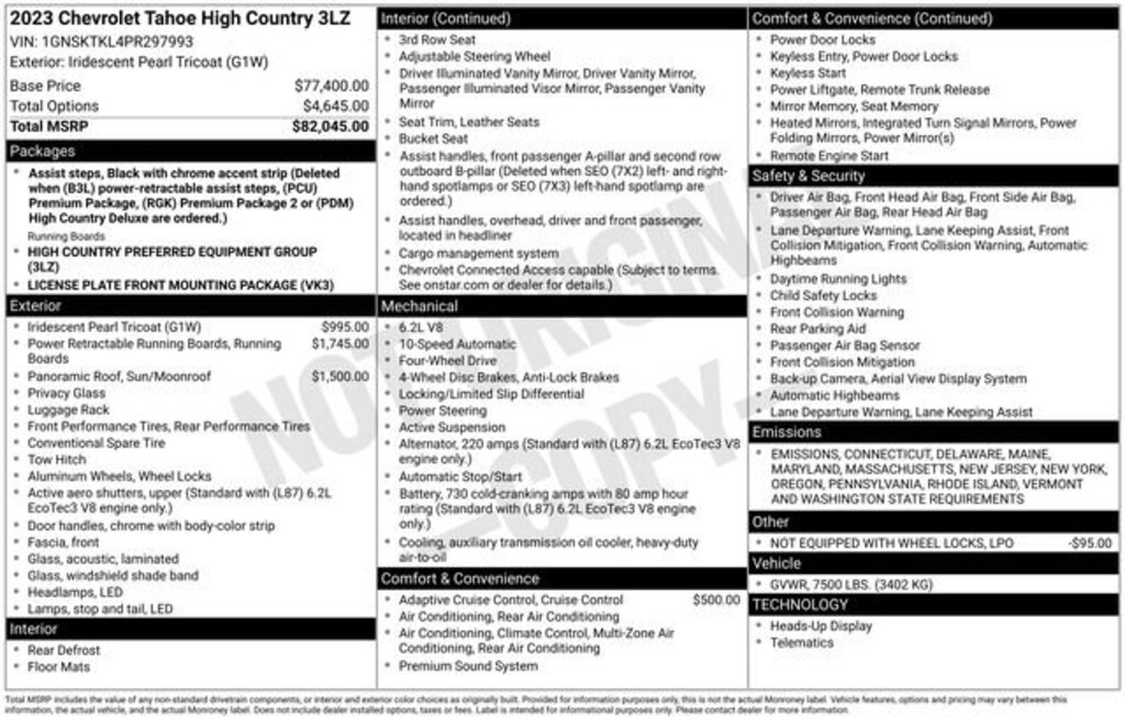 Recent Arrival!We Buy cars- Fast, Fair and Easy This 2023 Iridescent Pearl Tricoat Chevrolet Tahoe High Country 4WD is well equipped and includes these features and benefits: License Plate Front Mounting Package, Preferred Equipment Group 3LZ (15 Diagonal Multi-Color Head-Up Display, 1st & 2nd Row Color-Keyed Carpeted Floor Mats, 2-Speed Active Electronic AutoTrac Transfer Case, 3rd Row 60/40 Power-Folding Split-Bench Seat, Bose 10-Speaker Centerpoint Surround Audio Sys Ft, Bright Front & Rear Door Sill Plates, Chrome Door Handles w/Body-Color Strip, Color-Keyed Carpeting Floor Covering, Driver & Front Outboard Passenger Airbags, Dual Exhaust System, Enhanced Automatic Emergency Braking, Enhanced Driver Information Center, Floor Console, Hands-Free Rear Power Programmable Liftgate, HD Surround Vision, Heated 2nd Row Outboard Seats, Heated Steering Wheel, Hill Descent Control, Infotainment Display, Inside Rearview Auto-Dimming Rear Camera Mirror, Lane Change Alert w/Side Blind Zone Alert, LED Daytime Running Lamps, Memory Settings, Outside Heated Power-Adjustable Mirrors, Power Release 2nd Row Bucket Seats, Power Tilt & Telescopic Steering Column, Rear Camera Mirror Washer, Rear Cross Traffic Alert, Rear Pedestrian Alert, Remote Start, Safety Alert Seat, SiriusXM Radio w/360L, Universal Home Remote, Wireless Charging, and Wrapped Steering Wheel), 10 Speakers, 3.23 Rear Axle Ratio, 3rd row seats: split-bench, 4-Wheel Disc Brakes, ABS brakes, Adaptive Cruise Control, Adaptive suspension, Air Conditioning, Alloy wheels, AM/FM radio: SiriusXM with 360L, Apple CarPlay/Android Auto, Auto High-beam Headlights, Auto-dimming door mirrors, Auto-dimming Rear-View mirror, Auto-leveling suspension, Automatic temperature control, Brake assist, Bumpers: body-color, Compass, Delay-off headlights, Driver door bin, Driver vanity mirror, Dual front impact airbags, Dual front side impact airbags, Dual-Pane Power Panoramic Sunroof, Electronic Stability Control, Emergency communication system: OnStar and Chevrolet connected services capable, Exterior Parking Camera Rear, Four wheel independent suspension, Front anti-roll bar, Front Bucket Seats, Front Center Armrest, Front dual zone A/C, Front High-Back Reclining Bucket Seats, Front reading lights, Fully automatic headlights, Garage door transmitter, Heads-Up Display, Heated & Ventilated Driver & Front Passenger Seats, Heated door mirrors, Heated Driver & Front Passenger Seats, Heated front seats, Heated rear seats, Heated steering wheel, Illuminated entry, Low tire pressure warning, Magnetic Ride Control Suspension, Memory seat, Navigation System, Not Equipped w/Wheel Locks (LPO), Occupant sensing airbag, Outside temperature display, Overhead airbag, Overhead console, Panic alarm, Passenger door bin, Passenger vanity mirror, Perforated Leather Seat Trim, Power door mirrors, Power driver seat, Power Liftgate, Power passenger seat, Power steering, Power windows, Power-Retractable Assist Steps, Premium audio system: Chevrolet Infotainment 3 Premium, Radio: Chevrolet Infotainment 3 Premium System, Rain sensing wipers, Rear air conditioning, Rear anti-roll bar, Rear reading lights, Rear window defroster, Rear window wiper, Remote keyless entry, Roof rack: rails only, Security system, Set of 4 Wheel Locks (LPO), Speed control, Speed-sensing steering, Split folding rear seat, Spoiler, Steering wheel memory, Steering wheel mounted audio controls, Tachometer, Telescoping steering wheel, Tilt steering wheel, Traction control, Trip computer, Turn signal indicator mirrors, Variably intermittent wipers, Ventilated front seats, Voltmeter, and Wheels: 22 x 9 Sterling Silver Premium Painted.