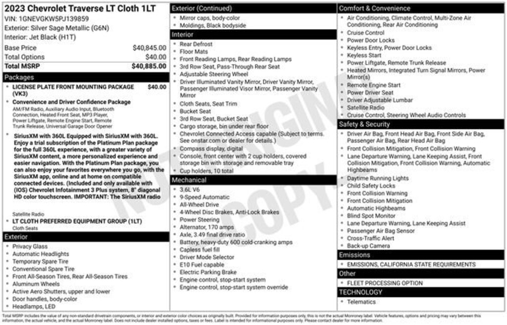 Recent Arrival! Clean CARFAX.We Buy cars- Fast, Fair and Easy This 2023 Silver Sage Metallic Chevrolet Traverse LT AWD is well equipped and includes these features and benefits: Front License Plate Bracket Mounting Package, Preferred Equipment Group 1LT (Heated Driver & Front Passenger Seats), 2-Way Manual Front Passenger Seat Adjuster, 3.49 Axle Ratio, 3rd row seats: split-bench, 4-Wheel Disc Brakes, 6 Speakers, 6-Speaker Audio System Feature, 8-Passenger Seating (2-3-3 Seating Configuration), 8-Way Power Driver Seat Adjuster, ABS brakes, Air Conditioning, Alloy wheels, AM/FM radio: SiriusXM, Apple CarPlay/Android Auto, Auto High-beam Headlights, Automatic temperature control, Black Roof Rails, Brake assist, Bumpers: body-color, Compass, Delay-off headlights, Driver door bin, Driver vanity mirror, Dual front impact airbags, Dual front side impact airbags, Electronic Stability Control, Emergency communication system, Exterior Parking Camera Rear, Four wheel independent suspension, Front anti-roll bar, Front Bucket Seats, Front Center Armrest, Front dual zone A/C, Front reading lights, Fully automatic headlights, Garage door transmitter, Heated door mirrors, Heated front seats, Illuminated entry, Leather steering wheel, Low tire pressure warning, Occupant sensing airbag, Outside temperature display, Overhead airbag, Overhead console, Panic alarm, Passenger door bin, Passenger vanity mirror, Power door mirrors, Power Driver Lumbar Control, Power driver seat, Power Liftgate, Power steering, Power windows, Premium Cloth Seat Trim, Radio data system, Radio: Chevrolet Infotainment 3 Plus System, Rear air conditioning, Rear anti-roll bar, Rear reading lights, Rear window defroster, Rear window wiper, Remote keyless entry, Security system, SiriusXM w/360L, Speed control, Speed-sensing steering, Spoiler, Steering wheel mounted audio controls, Tachometer, Telescoping steering wheel, Tilt steering wheel, Traction control, Trip computer, Turn signal indicator mirrors, Variably intermittent wipers, Voltmeter, and Wheels: 18 Bright Silver-Painted Aluminum.