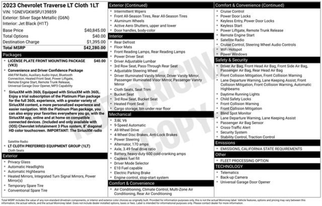 We Buy cars- Fast, Fair and Easy This 2023 Silver Sage Metallic Chevrolet Traverse LT AWD is well equipped and includes these features and benefits: Front License Plate Bracket Mounting Package, Preferred Equipment Group 1LT (Heated Driver & Front Passenger Seats), 2-Way Manual Front Passenger Seat Adjuster, 3.49 Axle Ratio, 3rd row seats: split-bench, 4-Wheel Disc Brakes, 6 Speakers, 6-Speaker Audio System Feature, 8-Passenger Seating (2-3-3 Seating Configuration), 8-Way Power Driver Seat Adjuster, ABS brakes, Air Conditioning, Alloy wheels, AM/FM radio: SiriusXM, Apple CarPlay/Android Auto, Auto High-beam Headlights, Automatic temperature control, Black Roof Rails, Brake assist, Bumpers: body-color, Compass, Delay-off headlights, Driver door bin, Driver vanity mirror, Dual front impact airbags, Dual front side impact airbags, Electronic Stability Control, Emergency communication system, Exterior Parking Camera Rear, Four wheel independent suspension, Front anti-roll bar, Front Bucket Seats, Front Center Armrest, Front dual zone A/C, Front reading lights, Fully automatic headlights, Garage door transmitter, Heated door mirrors, Heated front seats, Illuminated entry, Leather steering wheel, Low tire pressure warning, Occupant sensing airbag, Outside temperature display, Overhead airbag, Overhead console, Panic alarm, Passenger door bin, Passenger vanity mirror, Power door mirrors, Power Driver Lumbar Control, Power driver seat, Power Liftgate, Power steering, Power windows, Premium Cloth Seat Trim, Radio data system, Radio: Chevrolet Infotainment 3 Plus System, Rear air conditioning, Rear anti-roll bar, Rear reading lights, Rear window defroster, Rear window wiper, Remote keyless entry, Security system, SiriusXM w/360L, Speed control, Speed-sensing steering, Spoiler, Steering wheel mounted audio controls, Tachometer, Telescoping steering wheel, Tilt steering wheel, Traction control, Trip computer, Turn signal indicator mirrors, Variably intermittent wipers, Voltmeter, and Wheels: 18 Bright Silver-Painted Aluminum.