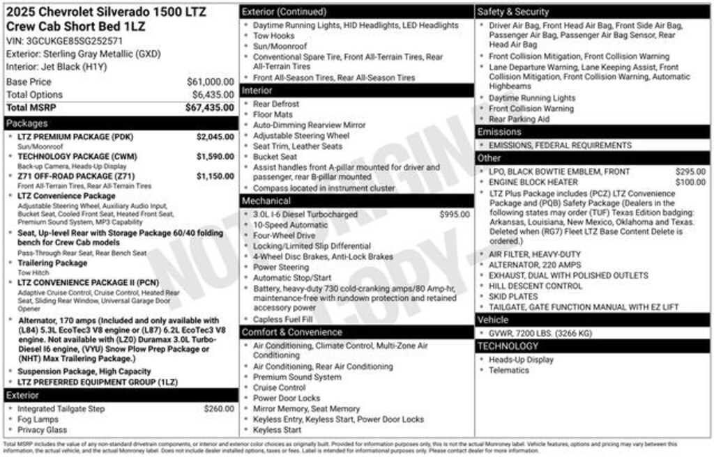 We Buy cars- Fast, Fair and Easy This 2025 Sterling Gray Metallic Chevrolet Silverado 1500 LTZ 4WD is well equipped and includes these features and benefits: High Capacity Suspension Package, LTZ Convenience Package (2 USB Data Ports, Floor Mounted Center Console, Power Tilt & Telescoping Steering Column, Premium Bose 7-Speaker Sound System, Ventilated Driver & Front Passenger Seats, and Wireless Charging), LTZ Convenience Package II (2nd Row Heated Outboard Seats, Adaptive Cruise Control, Power Sliding Rear Window w/Rear Defogger, and Universal Home Remote), LTZ Plus Package, LTZ Premium Package (Power Sunroof), Preferred Equipment Group 1LZ (10-Way Power Driver Seat w/Lumbar, 10-Way Power Passenger Seat Adjuster w/Lumbar, 12.3 Multicolor Reconfigurable Digital Display, 120-Volt Bed Mounted Power Outlet, 120-Volt Interior Power Outlet, Auto-Dimming Inside Rear-View Mirror, Auto-Locking Rear Differential, Bluetooth® For Phone, Chrome Mirror Caps, Color-Keyed Carpeting Floor Covering, Deep-Tinted Glass, Driver Memory, Dual Rear USB Ports (Charge Only), Electric Rear-Window Defogger, Electronic Cruise Control, Front Frame-Mounted Black Recovery Hooks, Front LED Fog Lamps, Front Rain-Sensing Wipers, Front Rubberized Vinyl Floor Mats, Heated Driver & Front Outboard Passenger Seats, Heated Steering Wheel, Hitch Guidance w/Hitch View, In-Vehicle Trailering System App, Integrated Trailer Brake Controller, Keyless Open & Start, LED Cargo Area Lighting, OnStar Services Capable, Outside Heated Power-Adjustable Mirrors, Power Front Passenger Windows w/Express Up/Down, Power Front Windows w/Driver Express Up/Down, Power Rear Windows w/Express Down, Power Tailgate, Rear Rubberized-Vinyl Floor Mats, Rear Wheelhouse Liners, Remote Vehicle Starter System, SiriusXM w/360L Trial Subscription, Standard Tailgate, Steering Wheel Audio Controls, Teen Driver, Theft Deterrent System (Unauthorized Entry), Tire Pressure Monitoring System, Wi-Fi Hot Spot Capable, and Wrapped Steering Wheel), Safety Package (HD Surround Vision, Perimeter Lighting, Rear Cross Traffic Braking, Rear Pedestrian Alert, Safety Alert Seat, Trailer Camera Provisions, Trailer Side Blind Zone Alert, and Ultrasonic Front & Rear Park Assist), Technology Package (15 Diagonal Multicolor Head-Up Display, Bed View Camera, and Rear Camera Mirror), Trailering Package (Hitch Guidance), Up-Level Rear Seat w/Storage Package, Z71 Off-Road Package (Heavy-Duty Air Filter, Hill Descent Control, and Off-Road Suspension), 170 Amp Alternator, 220 Amp Alternator, 3.23 Rear Axle Ratio, 4-Wheel Disc Brakes, 7 Speakers, ABS brakes, Air Conditioning, Alloy wheels, AM/FM radio: SiriusXM with 360L, Apple CarPlay/Android Auto, Auto High-beam Headlights, Auto-dimming door mirrors, Auto-dimming Rear-View mirror, Automatic Emergency Braking, Automatic temperature control, Brake assist, Bumpers: chrome, Compass, Delay-off headlights, Driver door bin, Driver vanity mirror, Dual Exhaust w/Polished Outlets, Dual front impact airbags, Dual front side impact airbags, Electronic Stability Control, Electronic Transmission Range Selector Shifter, Emergency communication system: OnStar, Engine Block Heater, EZ Lift Power Lock & Release Tailgate, Following Distance Indicator, Forward Collision Alert, Front anti-roll bar, Front Black Bowtie Emblem (LPO), Front Bucket Seats, Front Center Armrest, Front dual zone A/C, Front fog lights, Front Pedestrian Braking, Front reading lights, Front wheel independent suspension, Fully automatic headlights, Heated door mirrors, Heated front seats, Heated steering wheel, Illuminated entry, IntelliBeam Automatic High Beam On/Off, Lane Keep Assist w/Lane Departure Warning, Low tire pressure warning, Memory seat, Multi-Flex Tailgate, Occupant sensing airbag, Outside temperature display, Overhead airbag, Overhead con