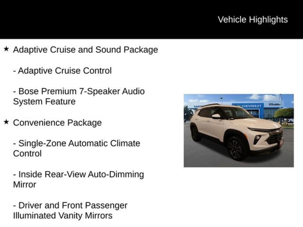 Recent Arrival! Clean CARFAX. 1 Type-A and 1 Type-C USB Charging-Only Ports, 120-Volt Power Outlet, Adaptive Cruise and Sound Package, Adaptive Cruise Control, Bose Premium 7-Speaker Audio System Feature, Convenience Package, Driver and Front Passenger Illuminated Vanity Mirrors, Driver Confidence Package, Hands Free Power Programmable Liftgate, Inside Rear-View Auto-Dimming Mirror, Lane Change Alert with Side Blind Zone Alert, Rear Cross Traffic Alert, Rear Park Assist, Single-Zone Automatic Climate Control, Wireless Charging. 26/29 City/Highway MPGWe Buy cars- Fast, Fair and Easy This 2025 Iridescent Pearl Tricoat Chevrolet TrailBlazer ACTIV AWD is well equipped and includes these features and benefits: Adaptive Cruise and Sound Package (Adaptive Cruise Control and Bose Premium 7-Speaker Audio System Feature), Convenience Package (1 Type-An and 1 Type-C USB Charging-Only Ports, 120-Volt Power Outlet, Driver and Front Passenger Illuminated Vanity Mirrors, Hands Free Power Programmable Liftgate, Inside Rear-View Auto-Dimming Mirror, Single-Zone Automatic Climate Control, Wireless Charging, and Cabin Humidity Sensor), Driver Confidence Package (Lane Change Alert with Side Blind Zone Alert, Rear Cross Traffic Alert, and Rear Park Assist), Preferred Equipment Group 1SA, 1 Type-An and 1 Type-C USB Ports, 2-Way Power Driver Lumbar Seat Adjuster, 3.17 Final Drive Axle Ratio, 4-Way Manual Front Passenger Seat Adjuster, 4-Wheel Disc Brakes, 6 Speakers, 6-Speaker Audio System Feature with Amplifier, 8-Way Power Driver Seat Adjuster, ABS brakes, Air Conditioning, Alloy wheels, AM/FM radio: SiriusXM, Auto High-beam Headlights, Brake assist, Bumpers: body-color, Compass, Delay-off headlights, Driver door bin, Driver vanity mirror, Dual front impact airbags, Dual front side impact airbags, Dual-Pane Panoramic Power Sunroof, Electronic Stability Control, Emergency communication system: OnStar and Chevrolet connected services capable, Evotex Seat Trim, Exterior Parking Camera Rear, Flat-Folding Front Passenger Seatback, Front anti-roll bar, Front Bucket Seats, Front Center Armrest, Front License Plate Bracket, Front reading lights, Front wheel independent suspension, Fully automatic headlights, Heated door mirrors, Heated Driver and Front Passenger Seats, Heated front seats, Heated steering wheel, Illuminated entry, Iridescent Pearl Tricoat Roof, Knee airbag, Low tire pressure warning, Occupant sensing airbag, Overhead airbag, Overhead console, Panic alarm, Passenger door bin, Passenger vanity mirror, Power door mirrors, Power driver seat, Power steering, Power windows, Radio data system, Radio: AM/FM Stereo Audio System, Rear seat center armrest, Rear side impact airbag, Rear window defroster, Rear window wiper, Remote keyless entry, Ride and Handling Suspension, Security system, SiriusXM Trial Subscription, Speed control, Split folding rear seat, Spoiler, Steering wheel mounted audio controls, Tachometer, Telescoping steering wheel, Tilt steering wheel, Traction control, Trip computer, Variably intermittent wipers, Wheels: 17 High Gloss Black Machined Aluminum, and Wireless Apple CarPlay/Android Auto.