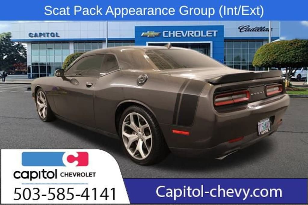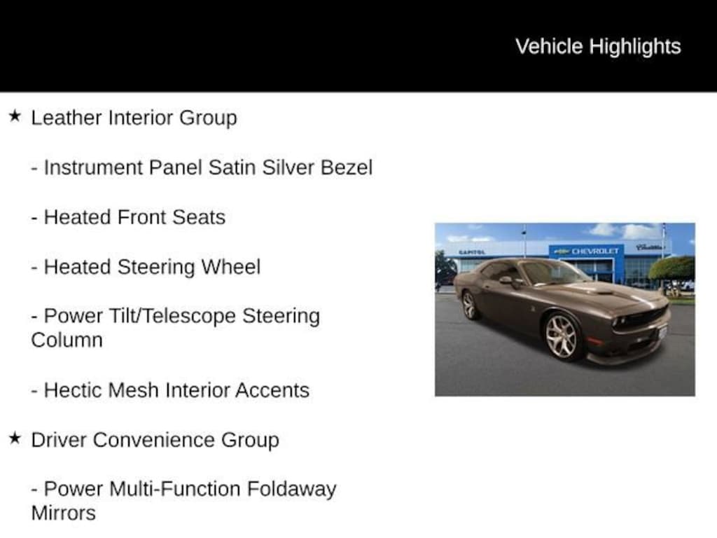 We Buy cars- Fast, Fair and Easy This 2016 Granite Crystal Metallic Clearcoat Dodge Challenger R/T Scat Pack RWD is well equipped and includes these features and benefits: Driver Convenience Group (Blind Spot & Cross Path Detection, Power Multi-Function Foldaway Mirrors, and Universal Garage Door Opener), Leather Interior Group (Heated Front Seats, Heated Steering Wheel, Hectic Mesh Interior Accents, Instrument Panel Satin Silver Bezel, and Power Tilt/Telescope Steering Column), Scat Pack Appearance Group (Int/Ext) (Black Fuel Filler Door, Black Grille w/Bezel, High-Intensity Discharge Headlamps, Leather Performance Steering Wheel, and Scat Pack Stripe), Premium Sound Group (18 Speakers Premium Audio System and harman/kardon GreenEdge Amp), Quick Order Package 23G R/T Scat Pack, Power Sunroof, 20 x 9.0 Aluminum Wheels, 230MM Rear Axle, 4-Wheel Disc Brakes, 5-Year SiriusXM Traffic Service, 5-Year SiriusXM Travel Link Service, 6 Speakers, 8.4 Touchscreen Display, ABS brakes, Air Conditioning, Alloy wheels, AM/FM radio: SiriusXM, Anti-whiplash front head restraints, Auto-dimming Rear-View mirror, Automatic temperature control, Brake assist, Bumpers: body-color, Cloth Performance Seats, Compass, Delay-off headlights, Driver door bin, Driver vanity mirror, Dual front impact airbags, Dual front side impact airbags, Electronic Stability Control, Emergency communication system: Uconnect Access, Four wheel independent suspension, Front anti-roll bar, Front Bucket Seats, Front Center Armrest, Front dual zone A/C, Front fog lights, Front reading lights, Fully automatic headlights, GPS Navigation, HD Radio, Heated door mirrors, Illuminated entry, Integrated Voice Command w/Bluetooth, Leather Shift Knob, Leather Trim Seats, Low tire pressure warning, Media Hub (SD, USB, AUX Ports), Outside temperature display, Overhead airbag, Overhead console, Panic alarm, ParkView Rear Back-Up Camera, Passenger door bin, Passenger vanity mirror, Power door mirrors, Power driver seat, Power steering, Power windows, Radio data system, Radio: Uconnect 8.4, Radio: Uconnect 8.4 NAV, Rear anti-roll bar, Rear reading lights, Rear seat center armrest, Rear window defroster, Remote keyless entry, Remote Start System, Security system, SiriusXM Satellite Radio, SiriusXM Traffic, SiriusXM Travel Link, Speed control, Speed-sensing steering, Split folding rear seat, Spoiler, Steering wheel mounted audio controls, Suede/Nappa Performance Seats w/R/T Logo, Tachometer, Telescoping steering wheel, Tilt steering wheel, Traction control, Trip computer, Uconnect Access, Variably intermittent wipers, Ventilated Front Seats, and Wheels: 20 x 9.0 Forged/Painted Aluminum.