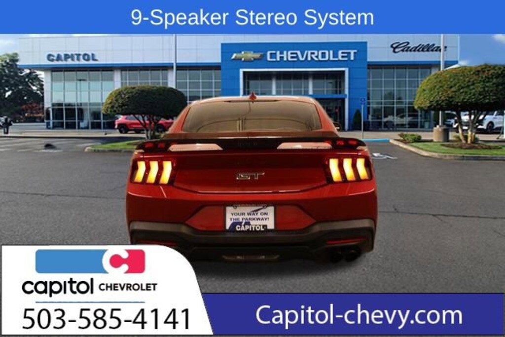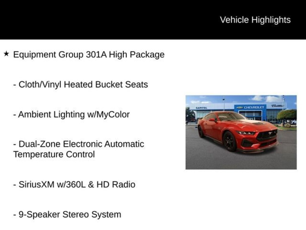 CARFAX One-Owner. 9-Speaker Stereo System, Ambient Lighting w/MyColor, Cloth/Vinyl Heated Bucket Seats, Dual-Zone Electronic Automatic Temperature Control, Equipment Group 301A High Package, SiriusXM w/360L & HD Radio.We Buy cars- Fast, Fair and Easy This 2024 Rapid Red Metallic Tinted Clearcoat Ford Mustang GT RWD is well equipped and includes these features and benefits: Equipment Group 301A High Package (9-Speaker Stereo System, Ambient Lighting w/MyColor, Cloth/Vinyl Heated Bucket Seats, Dual-Zone Electronic Automatic Temperature Control, and SiriusXM w/360L & HD Radio), 3.55 Limited Slip Rear Axle, 4-Wheel Disc Brakes, ABS brakes, Active Valve Performance Exhaust, Air Conditioning, Alloy wheels, AM/FM Stereo, Auto High-beam Headlights, Automatic temperature control, Brake assist, Bumpers: body-color, Compass, Delay-off headlights, Driver door bin, Driver vanity mirror, Dual front impact airbags, Dual front side impact airbags, Electronic Stability Control, Emergency communication system: 911 Assist, Exterior Parking Camera Rear, Four wheel independent suspension, Front anti-roll bar, Front Bucket Seats, Front Center Armrest, Front reading lights, Fully automatic headlights, Illuminated entry, Knee airbag, Leather Shift Knob, Leather steering wheel, Low tire pressure warning, Occupant sensing airbag, Outside temperature display, Overhead airbag, Overhead console, Panic alarm, Passenger door bin, Passenger vanity mirror, Power door mirrors, Power steering, Power windows, Radio data system, Rain sensing wipers, Rear anti-roll bar, Rear Parking Sensors, Rear window defroster, Remote keyless entry, Speed control, Speed-sensing steering, Speed-Sensitive Wipers, Split folding rear seat, Spoiler, Sport steering wheel, Steering wheel mounted audio controls, SYNC 4.0 QNX, Tachometer, Telescoping steering wheel, Tilt steering wheel, Traction control, Trip computer, Variably intermittent wipers, Voltmeter, and Wheels: 18 x 8.5 Ebony Black Painted Aluminum.