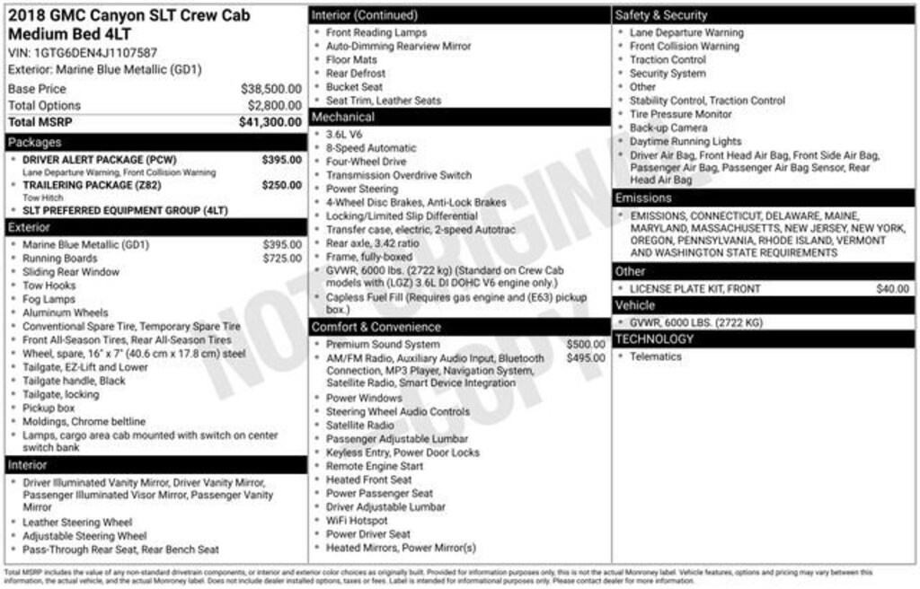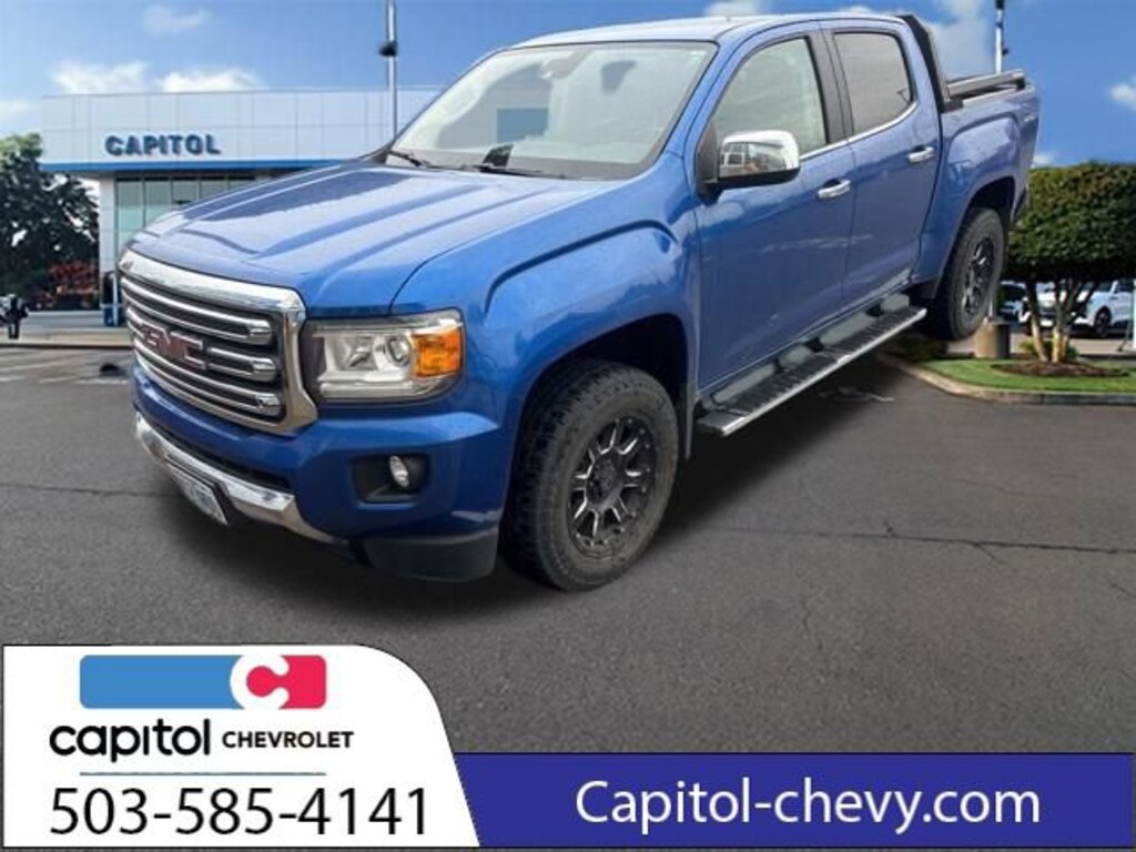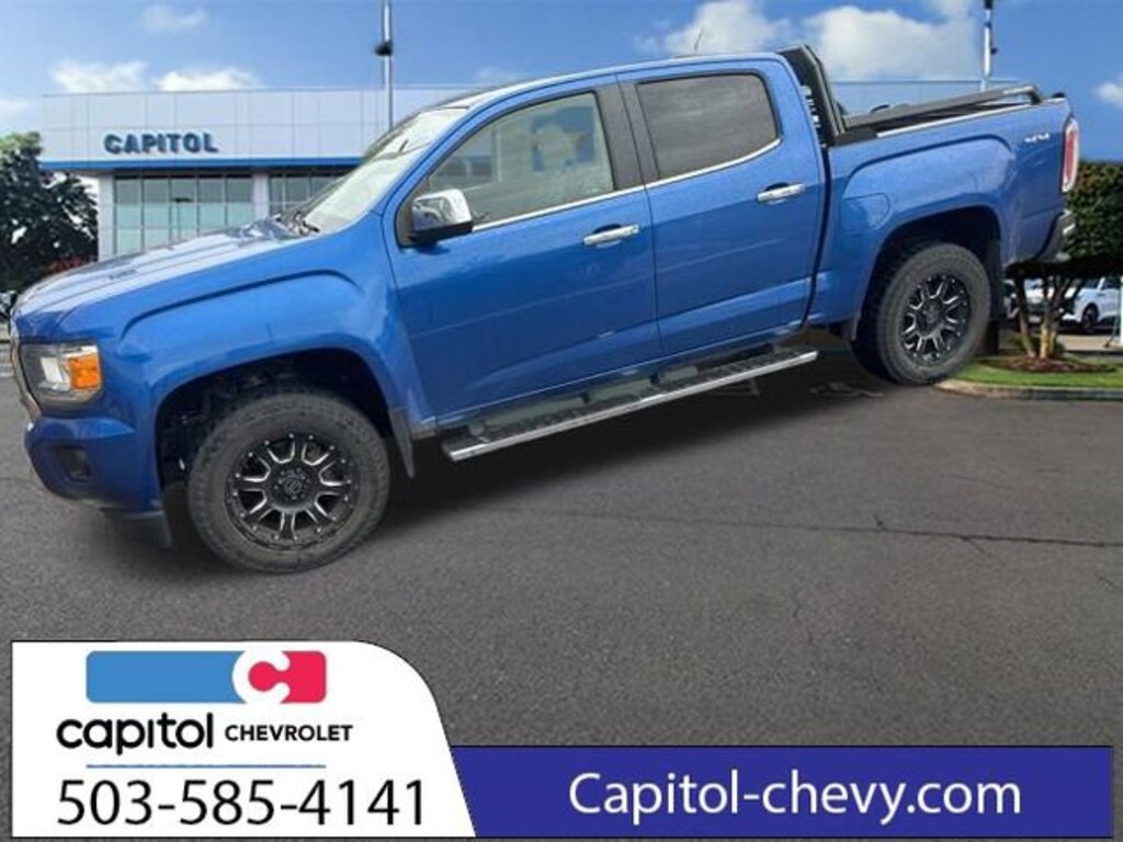 We Buy cars- Fast, Fair and Easy This 2018 Marine Blue Metallic GMC Canyon SLT 4WD is well equipped and includes these features and benefits: Driver Alert Package (Forward Collision Alert and Lane Departure Warning System), Preferred Equipment Group 4LT (Tow/Haul Mode and Trailering Assist Guideline Hitch Guidance), Trailering Package, 3.42 Rear Axle Ratio, 4-Way Power Front Passenger Seat Adjuster, 4-Wheel Disc Brakes, 5 Rectangular Chrome Assist Steps (LPO), 6 Speakers, ABS brakes, Air Conditioning, Alloy wheels, AM/FM radio: SiriusXM, Auto-dimming Rear-View mirror, Automatic temperature control, Bose Premium 7-Speaker Audio System Feature, Bumpers: body-color, Compass, Delay-off headlights, Driver 4-Way Power Seat Adjuster, Driver door bin, Driver vanity mirror, Dual front impact airbags, Dual front side impact airbags, Electronic Stability Control, Exterior Parking Camera Rear, Front anti-roll bar, Front Bucket Seats, Front Center Armrest, Front fog lights, Front License Plate Kit, Front reading lights, Front wheel independent suspension, Fully automatic headlights, Heated door mirrors, Heated Driver & Front Passenger Seats, Heated front seats, Illuminated entry, Leather-Appointed Seat Trim, Low tire pressure warning, Occupant sensing airbag, Outside temperature display, Overhead airbag, Overhead console, Panic alarm, Passenger door bin, Passenger vanity mirror, Power door mirrors, Power Driver Lumbar Control Seat Adjuster, Power driver seat, Power Passenger Lumbar Control Seat Adjuster, Power passenger seat, Power steering, Power windows, Premium audio system: GMC Infotainment System, Radio data system, Radio: AM/FM Stereo w/8 Color Touch Navigation, Radio: AM/FM Stereo w/8 Color Touch Screen, Rear reading lights, Rear seat center armrest, Rear step bumper, Rear window defroster, Remote keyless entry, Security system, SiriusXM Satellite Radio, Speed control, Speed-sensing steering, Steering wheel mounted audio controls, Tachometer, Telescoping steering wheel, Tilt steering wheel, Traction control, Trip computer, Variably intermittent wipers, and Wheels: 18 x 8.5 Polished Cast Aluminum.
