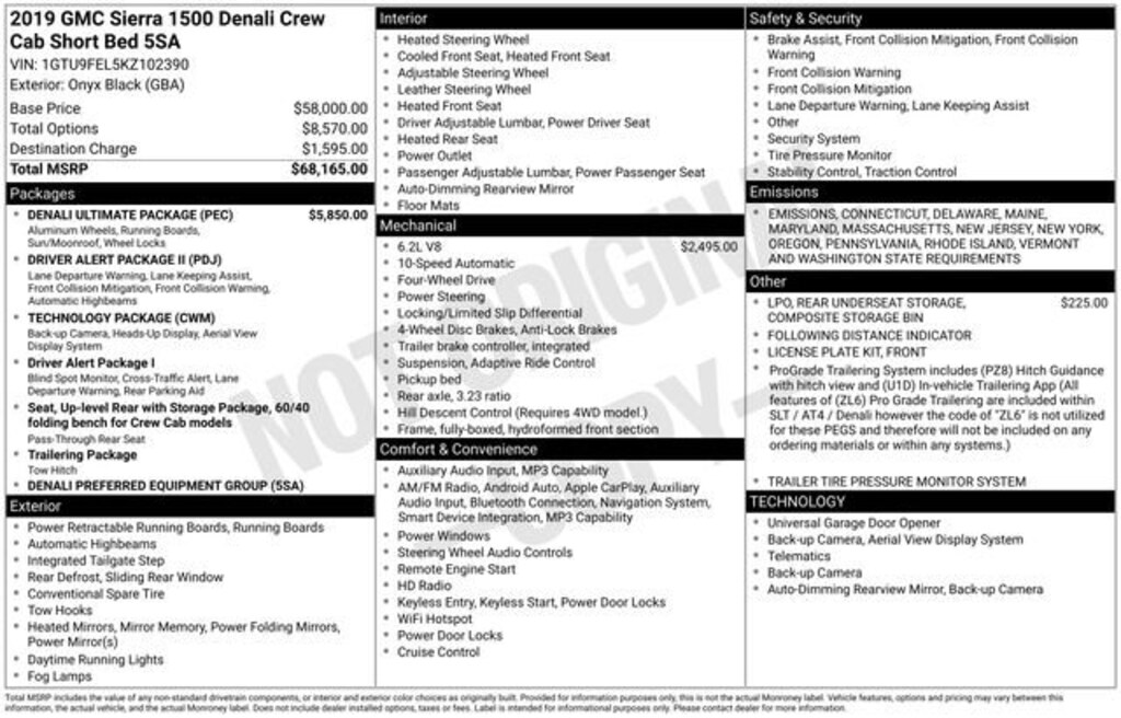 We Buy cars- Fast, Fair and Easy This 2019 Onyx Black GMC Sierra 1500 Denali 4WD is well equipped and includes these features and benefits: Denali Ultimate Package (GMC MultiPro Power Steps, Power Sunroof, and Trailer Tire Pressure Monitor System), Driver Alert Package I (Lane Change Alert w/Side Blind Zone Alert, Rear Cross Traffic Alert, and Ultrasonic Front & Rear Park Assist), Driver Alert Package II (Following Distance Indicator, Forward Collision Alert, Front Pedestrian Braking, IntelliBeam Automatic High Beam On/Off, Lane Keep Assist w/Lane Departure Warning, and Low Speed Forward Automatic Braking), Preferred Equipment Group 5SA (12-Volt Rear Auxiliary Power Outlet, 120-Volt Bed Mounted Power Outlet, 120-Volt Instrument Panel Power Outlet, 170 Amp Alternator, 2 USB Ports, 2 USB Ports (1st Row), Auxiliary External Transmission Oil Cooler, Chrome Assist Steps, Chrome Recovery Hooks, Color-Keyed Carpeting Floor Covering, Compass, Deep-Tinted Glass, Electric Rear-Window Defogger, Electrical Lock Control Steering Column, Floor Mounted Console, GMC 4G LTE, GMC Connected Access, HD Radio, HD Rear Vision Camera, Heated 2nd Row Outboard Seats, Heated Driver & Front Passenger Seating, Heavy-Duty Rear Locking Differential, High-Capacity Air Filter, Hill Descent Control, Hitch Guidance, Hitch Guidance w/Hitch View, In-Vehicle Trailering App, Integrated Trailer Brake Controller, Keyless Open & Start, LED Cargo Area Lighting, Manual Tilt-Wheel & Telescoping Steering Column, OnStar & GMC Connected Services Capable, Power Door Locks, Power Front Passenger Windows w/Express Up/Down, Power Front Windows w/Driver Express Up/Down, Power Rear Windows w/Express Down, Power Sliding Rear Window w/Rear Defogger, Rear Dual USB Charging-Only Ports, Rear Wheelhouse Liners, Remote Vehicle Starter System, Safety Alert Seat, Signature Denali Grille, Spray-On Pickup Bed Liner w/Denali Logo, Steering Wheel Audio Controls, Theft Deterrent System (Unauthorized Entry), Universal Home Remote, Ventilated Driver & Front Passenger Seats, and Wireless Charging), Technology Package (HD Surround Vision, Multi-Color 15 Diagonal Head-Up Display, and Rear Camera Mirror), Trailering Package, 10-Way Power Driver Seat Adjuster w/Lumbar, 10-Way Power Passenger Seat Adjuster w/Lumbar, 3.23 Rear Axle Ratio, 4-Wheel Disc Brakes, 7 Speakers, ABS brakes, Adaptive Ride Control Suspension, Adaptive suspension, Air Conditioning, Alloy wheels, AM/FM radio: SiriusXM, Apple CarPlay/Android Auto, Auto-dimming door mirrors, Auto-dimming Rear-View mirror, Automatic temperature control, Brake assist, Bumpers: body-color, Delay-off headlights, Driver door bin, Driver Memory, Driver vanity mirror, Dual front impact airbags, Dual front side impact airbags, Electronic Stability Control, Forge Perforated Leather-Appointed Seat Trim, Front anti-roll bar, Front Bucket Seats, Front Center Armrest, Front dual zone A/C, Front fog lights, Front License Plate Kit, Front reading lights, Front wheel independent suspension, Fully automatic headlights, Garage door transmitter, Genuine wood console insert, Genuine wood door panel insert, Heated door mirrors, Heated front seats, Heated rear seats, Heated steering wheel, Illuminated entry, Low tire pressure warning, Memory seat, Navigation System, Occupant sensing airbag, Outside temperature display, Overhead airbag, Overhead console, Panic alarm, Passenger door bin, Passenger vanity mirror, Power door mirrors, Power driver seat, Power passenger seat, Power steering, Power windows, Premium audio system: GMC Infotainment System, Premium Bose 7-Speaker Sound System, Radio data system, Radio: Premium GMC Infotainment Sys w/Navigation, Rear reading lights, Rear seat center armrest, Rear step bumper, Rear Underseat Storage (LPO), Rear window defroster, Remote keyless entry, Security system, SiriusXM Radio, Speed control, Speed-sensing steering, Split folding rear seat, Steering wheel mounted audio controls,