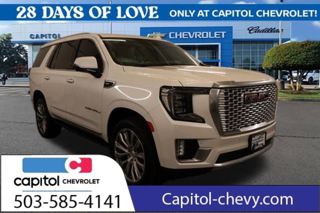 We Buy cars- Fast, Fair and Easy This 2021 White Frost Tricoat GMC Yukon Denali 4WD is well equipped and includes these features and benefits: Advanced Technology Package (Adaptive Cruise Control, Enhanced Automatic Emergency Braking, Inside Rearview Auto-Dimming Rear Camera Mirror, and Rear Camera Mirror Washer), Denali Premium Package (Dual-Pane Panoramic Power Sunroof and Power-Retractable Assist Steps), Advanced Security Package (Glass Breakage Sensor, Theft-Deterrent Alarm System, Vehicle Inclination Sensor, and Vehicle Interior Movement Sensor), License Plate Front Mounting Package, Preferred Equipment Group 5SA (12-Way Power Seat Adjusters, 15 Diagonal Multi-Color Head-Up Display, 2 Presets For Outside Rearview Mirrors, 3rd Row 60/40 Power-Folding Split-Bench Seat, Bright Front & Rear Door Sill Plates, Chrome Door Handles w/Body-Color Strip, Dual Exhaust System, Galvano Bodyside Moldings, Hands-Free Power Programmable Rear Liftgate, HD Surround Vision, Heated & Ventilated Driver & Front Passenger Seats, Heated 2nd Row Outboard Position Seats, Heated Automatic Steering Wheel, Heated Driver & Front Passenger Seats, Hill Descent Control, Inside Rear-View Auto-Dimming Mirror, Outside Heated Power-Adjustable Mirrors, Power Release 2nd Row Bucket Seats, Power Tilt & Telescopic Steering Column, Rear Pedestrian Alert, Safety Alert Seat, and Universal Home Remote), 14 Speakers, 3.23 Rear Axle Ratio, 3rd row seats: split-bench, 4-Wheel Disc Brakes, ABS brakes, Adaptive suspension, Air Conditioning, Alloy wheels, AM/FM radio: SiriusXM with 360L, Apple CarPlay/Android Auto, Auto High-beam Headlights, Auto-dimming door mirrors, Auto-dimming Rear-View mirror, Auto-leveling suspension, Automatic Emergency Braking, Automatic temperature control, Bodyside moldings, Bose 14-Speaker Surround w/CenterPoint, Brake assist, Bumpers: body-color, Compass, Delay-off headlights, Driver door bin, Driver vanity mirror, Dual front impact airbags, Dual front side impact airbags, Electronic Stability Control, Emergency communication system: OnStar and GMC connected services capable, Following Distance Indicator, Forward Collision Alert, Four wheel independent suspension, Front & Rear Park Assist, Front anti-roll bar, Front Bucket Seats, Front Center Armrest, Front dual zone A/C, Front fog lights, Front Pedestrian Braking, Front reading lights, Fully automatic headlights, Garage door transmitter, HD Radio, Heads-Up Display, Heated door mirrors, Heated front seats, Heated rear seats, Heated steering wheel, Illuminated entry, IntelliBeam Automatic High Beam On/Off, Lane Change Alert w/Side Blind Zone Alert, Lane Keep Assist w/Lane Departure Warning, Leather steering wheel, Low tire pressure warning, Magnetic Ride Control Suspension, Memory seat, Navigation System, Occupant sensing airbag, Outside temperature display, Overhead airbag, Overhead console, Panic alarm, Passenger door bin, Passenger vanity mirror, Perforated Leather Seating Surfaces, Power door mirrors, Power driver seat, Power Liftgate, Power passenger seat, Power Release 2nd Row 60/40 Split-Folding Bench Seat, Power steering, Power windows, Radio: AM/FM/SiriusXM w/Navigation, Rain sensing wipers, Rear air conditioning, Rear anti-roll bar, Rear Cross Traffic Alert, Rear reading lights, Rear window defroster, Rear window wiper, Remote keyless entry, Roof rack: rails only, Security system, SiriusXM w/360L, Speed control, Speed-sensing steering, Split folding rear seat, Spoiler, Steering wheel memory, Steering wheel mounted audio controls, Tachometer, Telescoping steering wheel, Tilt steering wheel, Traction control, Trip computer, Turn signal indicator mirrors, Variably intermittent wipers, Ventilated front seats, Volt