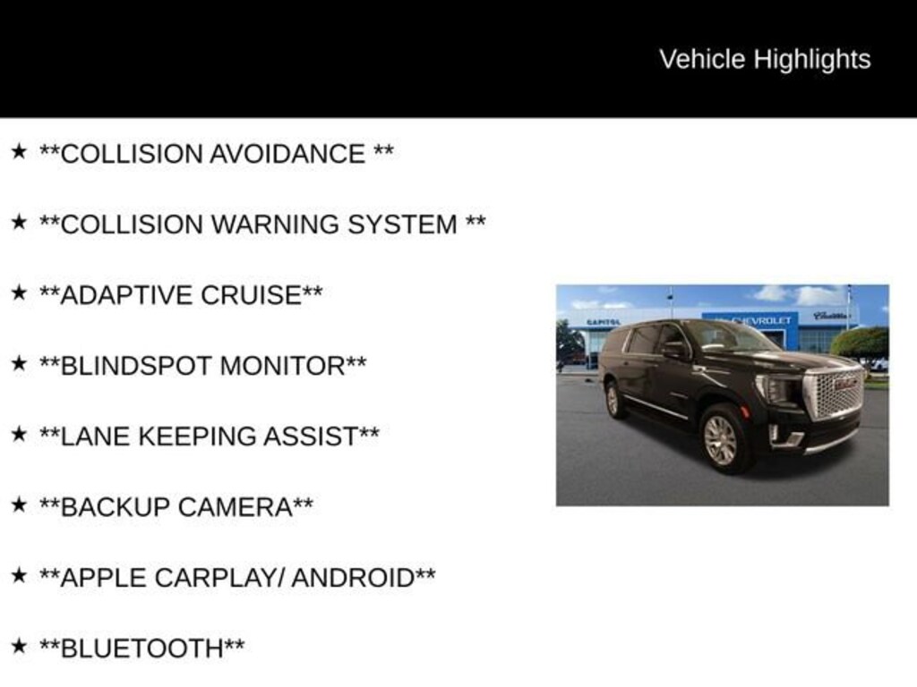Clean CARFAX. **COLLISION AVOIDANCE **, **COLLISION WARNING SYSTEM **, **ADAPTIVE CRUISE**, **BLINDSPOT MONITOR**, **LANE KEEPING ASSIST**, **BACKUP CAMERA**, **APPLE CARPLAY/ ANDROID**, **BLUETOOTH**, Dual-Pane Panoramic Power Sunroof. Priced below KBB Fair Purchase Price! Odometer is 8892 miles below market average!We Buy cars- Fast, Fair and Easy This 2023 Onyx Black GMC Yukon XL Denali 4WD is well equipped and includes these features and benefits: Advanced Security Package (Glass Breakage Sensor, Theft-Deterrent Alarm System, Vehicle Inclination Sensor, and Vehicle Interior Movement Sensor), Advanced Technology Package (Enhanced Automatic Parking Assist, Inside Rearview Auto-Dimming Rear Camera Mirror, Rear Camera Mirror Washer, and Reverse Automatic Braking), Max Trailering Package, Premium Capability Package w/Active Response 4WD (Air Ride Adaptive Suspension and Electronic Limited Slip Differential (eLSD)), Dual-Pane Panoramic Power Sunroof, 15 Diagonal Multi-Color Head-Up Display, 2 Presets For Outside Rearview Mirrors, 3 Years of GMC Connected Services, 3 Years of OnStar Safety & Security, 3 Years of OnStar Safety & Security (DISC), 3.23 Rear Axle Ratio, 3rd Row 60/40 Power-Folding Split-Bench Seat, 3rd row seats: split-bench, 4-Wheel Disc Brakes, ABS brakes, Adaptive Cruise Control, Adaptive suspension, Air Conditioning, Alloy wheels, AM/FM radio: SiriusXM with 360L, AM/FM Stereo, Apple CarPlay/Android Auto, Auto High-beam Headlights, Auto-dimming door mirrors, Auto-dimming Rear-View mirror, Auto-leveling suspension, Automatic temperature control, Bodyside moldings, Brake assist, Bright Front & Rear Door Sill Plates, Bumpers: body-color, Chrome Door Handles w/Body-Color Strip, Compass, Delay-off headlights, Driver door bin, Driver vanity mirror, Dual Exhaust System, Dual front impact airbags, Dual front side impact airbags, Electronic Stability Control, Emergency communication system: OnStar and GMC connected services capable, Enhanced Automatic Emergency Braking, Extra Capacity Cooling System, Floor Console, Four wheel independent suspension, Front anti-roll bar, Front Bucket Seats, Front Center Armrest, Front dual zone A/C, Front fog lights, Front reading lights, Fully automatic headlights, Garage door transmitter, Hands-Free Power Programmable Rear Liftgate, HD Surround Vision, Heads-Up Display, Heated & Ventilated Driver & Front Passenger Seats, Heated 2nd Row Outboard Position Seats, Heated door mirrors, Heated Driver & Front Passenger Seats, Heated front seats, Heated rear seats, Heated Steering Wheel, Heated steering wheel, Hill Descent Control, Hitch Guidance w/Hitch View, Illuminated entry, Integrated Trailer Brake Controller, Lane Keep Assist w/Lane Departure Warning, Low tire pressure warning, Magnetic Ride Control Suspension, Memory seat, Navigation System, Occupant sensing airbag, Outside Heated Power-Adjustable Mirrors, Outside temperature display, Overhead airbag, Overhead console, Panic alarm, Passenger door bin, Passenger vanity mirror, Power door mirrors, Power driver seat, Power Liftgate, Power passenger seat, Power Release 2nd Row Bucket Seats, Power steering, Power Tilt & Telescopic Steering Column, Power windows, Power-Retractable Assist Steps, Rain sensing wipers, Rear air conditioning, Rear anti-roll bar, Rear Cross Traffic Alert, Rear Pedestrian Alert, Rear reading lights, Rear Seat Media System, Rear window defroster, Rear window wiper, Remote keyless entry, Roof rack: rails only, Safety Alert Seat, Security system, SiriusXM w/360L, Smart Trailer Integration Indicator, Speed control, Speed-sensing steering, Split folding rear seat, Spoiler, Sport Pedal Cover Kit (LPO), Steering wheel memory, Steering wheel mounted audio controls, Tachometer, Telescoping steering wheel, Tilt steering wheel, Traction control, Trailer Side Blind Zone Alert, Trip computer, Turn signal indicator mirrors, Universal Home Remote, Variably intermittent wipers, Ventilated front seats, Voltmeter, and Wirel