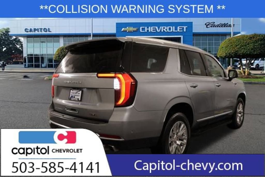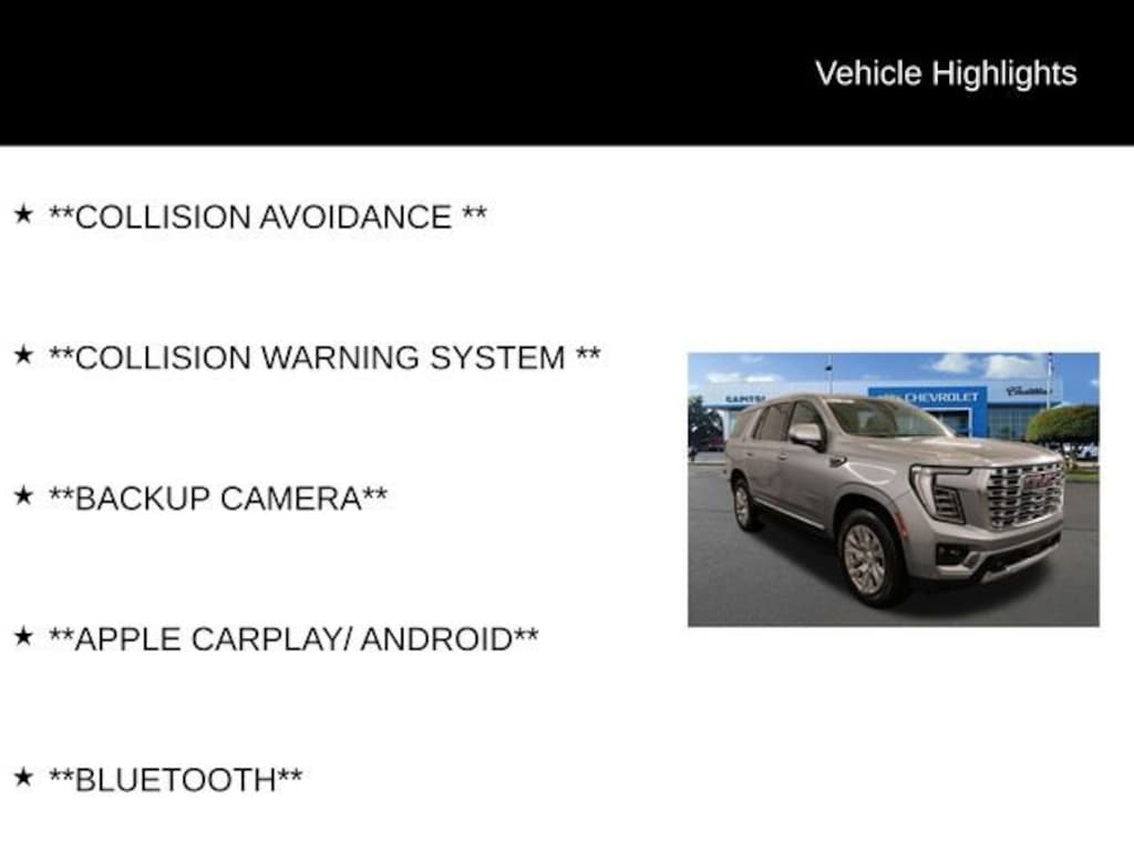 We Buy cars- Fast, Fair and Easy This 2025 Sterling Metallic GMC Yukon Denali 4WD is well equipped and includes these features and benefits: Preferred Equipment Group 5SA (15 Diagonal Multi-Color Head-Up Display, 4-Way Power Driver Lumbar Seat Adjuster, 4-Way Power Front Passenger Lumbar Seat Adjuster, AutoSense Hands-Free Power Liftgate, Bright Front and Rear Door Sill Plates, Dual Exhaust System, Galvano Bodyside Moldings, Magnetic Ride Control Suspension, Perforated Heather and Ventilated Driver and Front Passenger Seats, Power Release 2nd Row Bucket Seats, Power Tilt and Telescopic Steering Column, and Wheels: 20 x 9 6-Spoke Polished Aluminum), 10 Speakers, 3.23 Rear Axle Ratio, 3rd row seats: split-bench, 4-Wheel Disc Brakes, ABS brakes, Adaptive suspension, Air Conditioning, Alloy wheels, AM/FM radio: SiriusXM with 360L, Apple CarPlay/Android Auto, Audio memory, Auto High-beam Headlights, Auto-dimming door mirrors, Auto-dimming Rear-View mirror, Auto-leveling suspension, Automatic temperature control, Bodyside moldings, Bose 10-Speaker Surround with CenterPoint, Brake assist, Bumpers: body-color, Compass, Delay-off headlights, Deleted OnStar Basics, Driver door bin, Driver vanity mirror, Dual front impact airbags, Dual front side impact airbags, Electronic Stability Control, Emergency communication system: OnStar and GMC connected services capable, Exterior Parking Camera Rear, Four wheel independent suspension, Front anti-roll bar, Front Bucket Seats, Front Center Armrest, Front dual zone A/C, Front fog lights, Front reading lights, Fully automatic headlights, Garage door transmitter, Heads-Up Display, Heated door mirrors, Heated Driver and Front Passenger Seats, Heated front seats, Heated rear seats, Heated steering wheel, Illuminated entry, Low tire pressure warning, Memory seat, Navigation system: GMC Connected Navigation, Occupant sensing airbag, Outside temperature display, Overhead airbag, Overhead console, Panic alarm, Passenger door bin, Passenger vanity mirror, Perforated Leather Seating Surfaces, Power door mirrors, Power driver seat, Power Liftgate, Power passenger seat, Power steering, Power windows, Radio: 16.8 Diagonal Premium GMC Infotainment System, Rain sensing wipers, Rear air conditioning, Rear anti-roll bar, Rear reading lights, Rear window defroster, Rear window wiper, Remote keyless entry, Security system, SiriusXM with 360L, Speed control, Speed-sensing steering, Split folding rear seat, Spoiler, Steering wheel memory, Steering wheel mounted audio controls, Tachometer, Telescoping steering wheel, Tilt steering wheel, Traction control, Trip computer, Turn signal indicator mirrors, Variably intermittent wipers, Ventilated front seats, and Voltmeter.