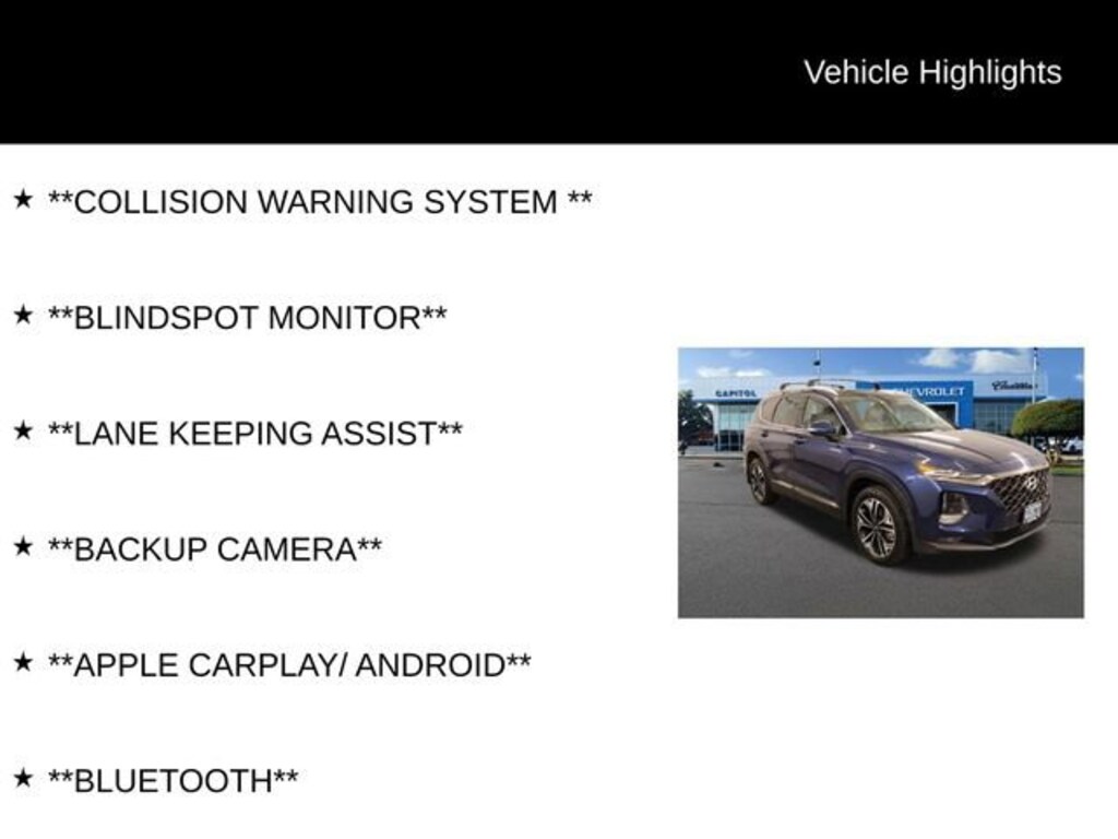 We Buy cars- Fast, Fair and Easy This 2020 Stormy Sea Hyundai Santa Fe Limited AWD is well equipped and includes these features and benefits: Option Group 01, 12 Speakers, 4-Wheel Disc Brakes, ABS brakes, Air Conditioning, Alloy wheels, AM/FM radio: SiriusXM, Apple CarPlay & Android Auto, Auto High-beam Headlights, Auto-dimming Rear-View mirror, Automatic temperature control, Axle Ratio 3.510, Brake assist, Bumpers: body-color, Cargo Net, Carpeted Floor Mats, Compass, Delay-off headlights, Driver door bin, Driver vanity mirror, Dual front impact airbags, Dual front side impact airbags, Electronic Stability Control, Emergency communication system, First Aid Kit, Four wheel independent suspension, Front anti-roll bar, Front Bucket Seats, Front Center Armrest, Front dual zone A/C, Front fog lights, Front reading lights, Fully automatic headlights, Garage door transmitter: HomeLink, Heads-Up Display, Heated & Ventilated Front Bucket Seats, Heated door mirrors, Heated front seats, Heated rear seats, Heated steering wheel, Illuminated entry, Leather Seating Surface, Leather Shift Knob, Leather steering wheel, Low tire pressure warning, Memory seat, Mudguards, Navigation System, Occupant sensing airbag, Outside temperature display, Overhead airbag, Overhead console, Panic alarm, Passenger door bin, Passenger vanity mirror, Power door mirrors, Power driver seat, Power Liftgate, Power moonroof, Power passenger seat, Power steering, Power windows, Radio: Infinity Premium AM/FM/MP3 Display Audio, Rain sensing wipers, Rear anti-roll bar, Rear Parking Sensors, Rear seat center armrest, Rear window defroster, Rear window wiper, Remote keyless entry, Roof Rack Cross Bars, Security system, Speed control, Speed-sensing steering, Split folding rear seat, Spoiler, Steering wheel mounted audio controls, Tachometer, Telescoping steering wheel, Tilt steering wheel, Traction control, Trip computer, Turn signal indicator mirrors, Variably intermittent wipers, Ventilated front seats, and Wheels: 19 x 7.5J Alloy.