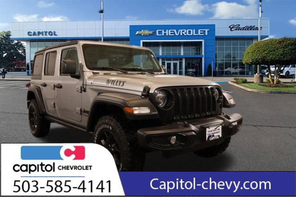 We Buy cars- Fast, Fair and Easy This 2021 Billet Silver Metallic Clearcoat Jeep Wrangler Unlimited Willys 4WD is well equipped and includes these features and benefits: LED Headlamp & Fog Lamp Group (Front LED Fog Lamps and LED Premium Reflector Headlamps), Quick Order Package 23W Willys (4-Wheel Drive Swing Gate Decal, Anti-Spin Differential Rear Axle, Automatic Headlamps, Black Grille, Black Trail Rated Badge, Deep Tint Sunscreen Windows, Front 1-Touch Down Power Windows, Leather Wrapped Steering Wheel, Matte Black Jeep Badge, Mold In Color Bumper w/Gloss Black, MOPAR All-Weather Floor Mats, Power Heated Mirrors, Remote Keyless Entry, Security Alarm, Speed Sensitive Power Locks, Sun Visors w/Illuminated Vanity Mirrors, Wheels: 17 x 7.5 Moab Black Aluminum, Willys, Willys Hood Decal, and Wrangler Decal), Technology Group (7.0 Touchscreen Display, Air Conditioning w/Auto Temperature Control, Air Filtering, Apple CarPlay, Cluster 7.0 TFT Color Display, Google Android Auto, GPS Antenna Input, Integrated Center Stack Radio, Radio: Uconnect 4 w/7 Display, SiriusXM Satellite Radio, USB Host Flip, For More Info, Call 800-643-2112, and SiriusXM Radio Service), Trailer Tow & HD Electrical Group (240 Amp Alternator, 7 & 4 Pin Wiring Harness, 700 Amp Maintenance Free Battery, Auxiliary Switches, and Class II Receiver Hitch), Black 3-Piece Hard Top, Freedom Panel Storage Bag, No Soft Top, Rear Window Defroster, Rear Window Wiper/Washer, 3.45 Rear Axle Ratio, 4-Wheel Disc Brakes, 8 Speakers, ABS brakes, Air Conditioning, AM/FM radio, Aux Battery, Brake assist, Cloth Low-Back Bucket Seats, Compass, Delay-off headlights, Driver door bin, Driver vanity mirror, Dual front impact airbags, Dual front side impact airbags, Electronic Stability Control, Front anti-roll bar, Front Bucket Seats, Front Center Armrest w/Storage, Front fog lights, Front reading lights, Integrated roll-over protection, Low tire pressure warning, MOPAR All-Weather Floor Mats (DISC), MOPAR Hardtop Headliner, Non-Lock Fuel Cap w/o Discriminator, Normal Duty Suspension, Occupant sensing airbag, Outside temperature display, ParkView Rear Back-Up Camera, Passenger door bin, Passenger vanity mirror, Power steering, Radio data system, Radio: Uconnect 3 w/5 Display, Rear anti-roll bar, Rear reading lights, Speed control, Split folding rear seat, Steering wheel mounted audio controls, Stop-Start Dual Battery System, Tachometer, Telescoping steering wheel, Tilt steering wheel, Traction control, Trip computer, Variably intermittent wipers, and Wheels: 17 x 7.5 Black Steel Styled.