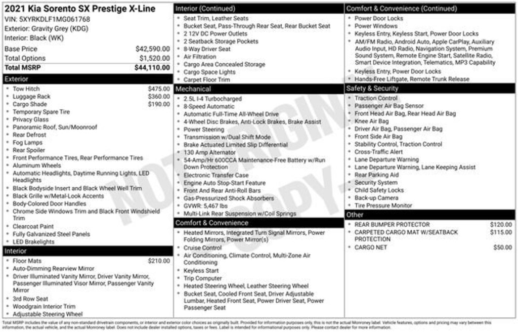 Clean CARFAX. ABS brakes, Active Cruise Control, Alloy wheels, Electronic Stability Control, Front dual zone A/C, Heated & Ventilated Front Bucket Seats, Heated door mirrors, Heated front seats, Illuminated entry, Low tire pressure warning, Navigation System, Power Liftgate, Power moonroof, Remote keyless entry, Traction control. Priced below KBB Fair Purchase Price! Odometer is 20412 miles below market average! 21/28 City/Highway MPGWe Buy cars- Fast, Fair and Easy This 2021 Gravity Gray Kia Sorento SX Prestige X-Line AWD is well equipped and includes these features and benefits: ABS brakes, Active Cruise Control, Alloy wheels, Electronic Stability Control, Front dual zone A/C, Heated & Ventilated Front Bucket Seats, Heated door mirrors, Heated front seats, Illuminated entry, Low tire pressure warning, Navigation System, Power Liftgate, Power moonroof, Remote keyless entry, Traction control, 12 Speakers, 3.316 Axle Ratio, 3rd row seats: split-bench, 4-Wheel Disc Brakes, Air Conditioning, AM/FM radio: SiriusXM, Apple CarPlay & Android Auto, Auto High-beam Headlights, Auto-dimming Rear-View mirror, Automatic temperature control, Brake assist, Bumpers: body-color, Delay-off headlights, Driver door bin, Driver vanity mirror, Dual front impact airbags, Dual front side impact airbags, Emergency communication system: UVO link, Four wheel independent suspension, Front anti-roll bar, Front Bucket Seats, Front Center Armrest, Front fog lights, Front reading lights, Fully automatic headlights, Heated steering wheel, Knee airbag, Leather steering wheel, Occupant sensing airbag, Outside temperature display, Overhead airbag, Overhead console, Panic alarm, Passenger door bin, Passenger vanity mirror, Perforated Genuine Leather Seat Trim, Power door mirrors, Power driver seat, Power passenger seat, Power steering, Power windows, Radio data system, Radio: AM/FM Premium Bose Audio System w/Nav, Rear air conditioning, Rear anti-roll bar, Rear reading lights, Rear window defroster, Rear window wiper, Roof rack, Security system, Smart Key w/ Push Button and Remote Start, Speed control, Speed-sensing steering, Split folding rear seat, Spoiler, Steering wheel mounted audio controls, Tachometer, Telescoping steering wheel, Tilt steering wheel, Trip computer, Turn signal indicator mirrors, Variably intermittent wipers, Ventilated front seats, and Wheels: 20 Grey Finish Alloy.