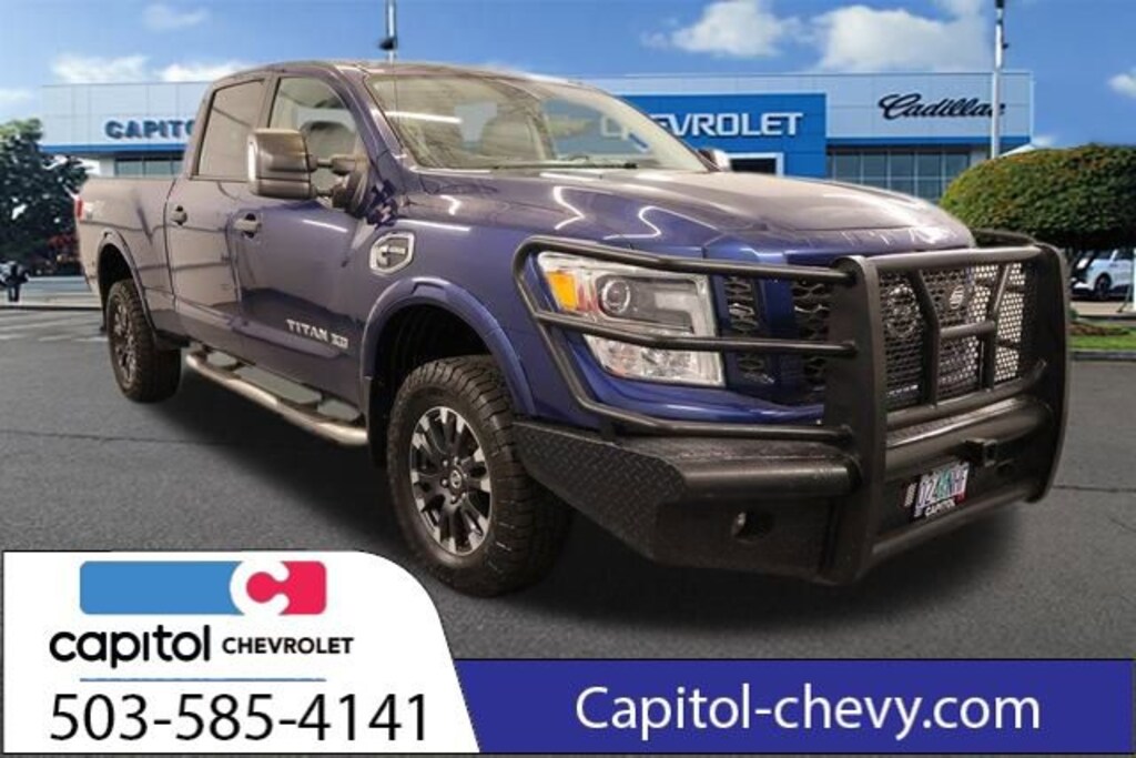 We Buy cars- Fast, Fair and Easy This 2018 Deep Blue Pearl Nissan Titan XD PRO-4X 4WD is well equipped and includes these features and benefits: 3.916 Axle Ratio, 4-Wheel Disc Brakes, 6 Speaker System, 6 Speakers, ABS brakes, Air Conditioning, Alloy wheels, AM/FM radio: SiriusXM, Automatic temperature control, Block heater, Brake assist, CD player, Delay-off headlights, Driver door bin, Driver vanity mirror, Dual front impact airbags, Dual front side impact airbags, Electronic Stability Control, Front anti-roll bar, Front Bucket Seats, Front Captain's Chairs, Front Center Armrest, Front dual zone A/C, Front fog lights, Front reading lights, Front wheel independent suspension, Heated door mirrors, Illuminated entry, Leather steering wheel, LED Fog Lights w/Bright Chrome Bezel, Low tire pressure warning, Navigation System, Outside temperature display, Overhead airbag, Overhead console, Panic alarm, Passenger door bin, Passenger vanity mirror, Power door mirrors, Power driver seat, Power steering, Power windows, Radio data system, Radio: NissanConnect w/Navigation & Mobile Apps, Rain sensing wipers, Rear anti-roll bar, Rear seat center armrest, Rear step bumper, Rear window defroster, Remote keyless entry, Rockford Fosgate Premium Audio w/12 Speakers, Security system, Speed control, Speed-sensing steering, Speed-Sensitive Wipers, Splash Guards, Split folding rear seat, Stain Resistant Cloth Seat Trim w/Vinyl Bolsters, Steering wheel mounted audio controls, Tachometer, Telescoping steering wheel, Tilt steering wheel, Traction control, Turn signal indicator mirrors, Variably intermittent wipers, Voltmeter, and Wheels: 18 x 7.5 Painted Dark Finish Alloy.