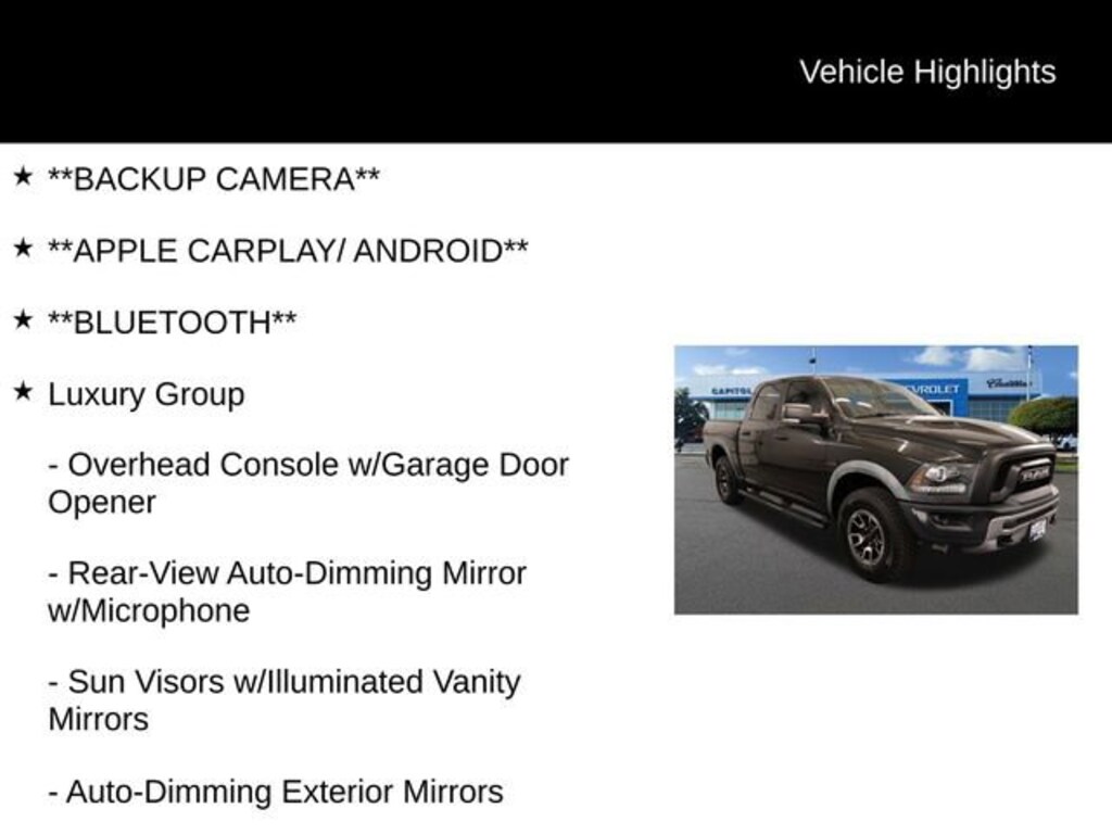 We Buy cars- Fast, Fair and Easy This 2016 Brilliant Black Crystal Pearlcoat Ram 1500 Rebel 4WD is well equipped and includes these features and benefits: Luxury Group (Auto-Dimming Exterior Mirrors, Exterior Mirrors Courtesy Lamps, Exterior Mirrors w/Supplemental Signals, Glove Box Lamp, LED Bed Lighting, Overhead Console w/Garage Door Opener, Power Folding Mirrors, Power Heated Fold-Away Mirrors, Rear Dome w/On/Off Switch Lamp, Rear-View Auto-Dimming Mirror w/Microphone, Sun Visors w/Illuminated Vanity Mirrors, Underhood Lamp, and Universal Garage Door Opener), Protection Group, Quick Order Package 26W Rebel (Dual Rear Exhaust w/Bright Tips, Flat Black 5.7L Hemi Badge, Flat Black Ram 1500 Badge, and Ram Glove Box Badge), Rear Camera & Park Assist Group (ParkSense Rear Park Assist System, ParkView Rear Back-Up Camera, and Rear View Auto Dim Mirror w/Display), Remote Start & Security Alarm Group (Security Alarm), Power Sunroof, 1 Yr. Trial (Registration Required), 3.92 Rear Axle Ratio, 32 Gallon Fuel Tank, 4-Wheel Disc Brakes, 5-Year SiriusXM Traffic Service, 5-Year SiriusXM Travel Link Service, 6 Speakers, 8.4 Touchscreen Display, 9 Alpine Speakers w/Subwoofer, ABS brakes, Air Conditioning, Alloy wheels, AM/FM radio, Anti-Spin Differential Rear Axle, Auto-leveling suspension, Brake assist, Compass, Delay-off headlights, Driver door bin, Dual front impact airbags, Dual front side impact airbags, Electronic Shift, Electronic Stability Control, For Details Visit DriveUconnect.com, Front anti-roll bar, Front Bucket Seats, Front Center Armrest w/Storage, Front fog lights, Front reading lights, Front wheel independent suspension, Fully automatic headlights, GPS Antenna Input, GPS Navigation, HD Radio, Heated door mirrors, Heated front seats, Heated steering wheel, Illuminated entry, Integrated Voice Command w/Bluetooth, Keyless Enter-N-Go, Leather steering wheel, Low tire pressure warning, Media Hub (SD, USB, AUX), Occupant sensing airbag, Outside temperature display, Overhead airbag, Overhead console, Panic alarm, Passenger door bin, Passenger vanity mirror, Power door mirrors, Power driver seat, Power passenger seat, Power steering, Power windows, Premium Cloth Seats w/Emboss Tread Pattern, Radio data system, Radio: Uconnect 5.0, Radio: Uconnect 8.4 NAV, Rear anti-roll bar, Rear seat center armrest, Rear step bumper, Rebel Instrument Cluster, Remote keyless entry, Remote Proximity Keyless Entry, Remote SD Card Slot, Single Disc Remote CD Player, SIRIUSXM Satellite Radio, SIRIUSXM Traffic, SiriusXM Travel Link, Speed control, Split folding rear seat, Steering wheel mounted audio controls, Tachometer, Tilt steering wheel, Tip Start, Traction control, Trip computer, Uconnect Access, Uconnect Access 1 Year Trial, Variably intermittent wipers, Voltmeter, and Wheels: 17 x 8 Aluminum w/Matte Black PockeT.