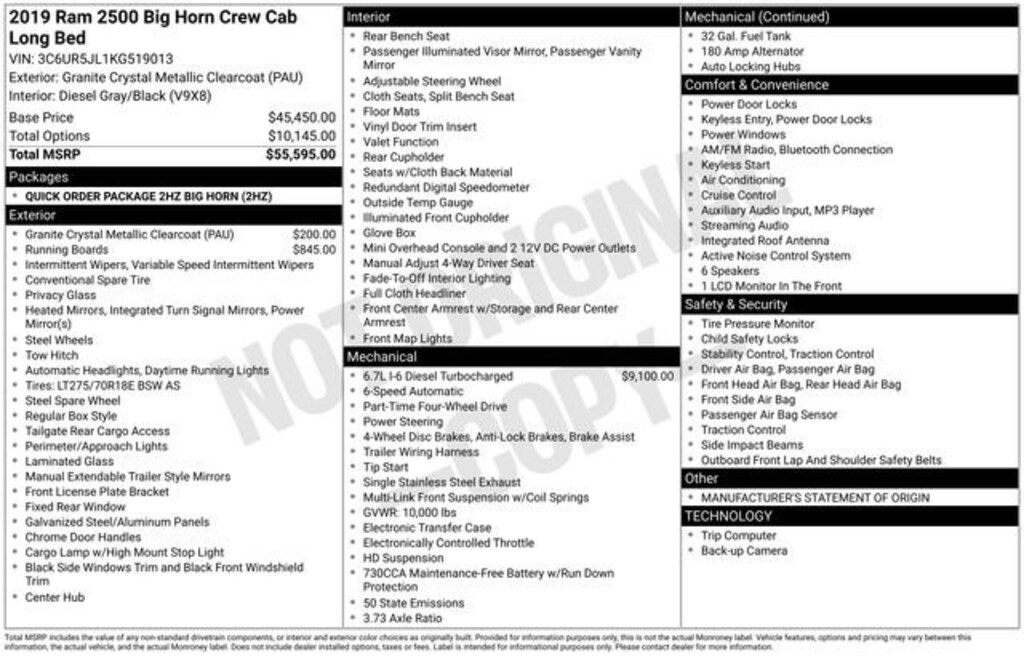 Recent Arrival! Odometer is 25339 miles below market average!We Buy cars- Fast, Fair and Easy This 2019 Granite Crystal Metallic Clearcoat Ram 2500 Big Horn 4WD is well equipped and includes these features and benefits: Quick Order Package 2HZ Big Horn, 2 Way Rear Headrest Seat, 3.73 Axle Ratio, 4 Way Front Headrests, 4-Wheel Disc Brakes, 40/20/40 Split Bench Seat, 6 Speakers, ABS brakes, Active Noise Control System, Air Conditioning, AM/FM radio, Brake assist, Bumpers: chrome, Center Hub, Center Stack Storage Drawer, Cloth 40/20/40 Bench Seat, Compass, Delay-off headlights, Driver door bin, Dual front impact airbags, Dual front side impact airbags, Electronic Stability Control, Electronically Controlled Throttle, Front anti-roll bar, Front Center Armrest w/Storage, Front reading lights, Fully automatic headlights, Heated door mirrors, Illuminated entry, Low tire pressure warning, Manual Adjust 4-Way Driver Seat, Manufacturer's Statement of Origin, Occupant sensing airbag, Outside temperature display, Overhead airbag, Overhead console, Painted Flat Wheel-to-Wheel Side Steps, Panic alarm, ParkView Rear Back-Up Camera, Passenger door bin, Passenger vanity mirror, Power door mirrors, Power steering, Power windows, Radio data system, Radio: Uconnect 3 w/5 Display, Rear anti-roll bar, Rear Folding Seat, Rear seat center armrest, Rear step bumper, Remote keyless entry, Selectable Tire Fill Alert, Speed control, Tachometer, Tilt steering wheel, Tip Start, Traction control, Trip computer, Turn signal indicator mirrors, Variably intermittent wipers, Voltmeter, and Wheels: 18 x 8.0 Steel Chrome Clad.