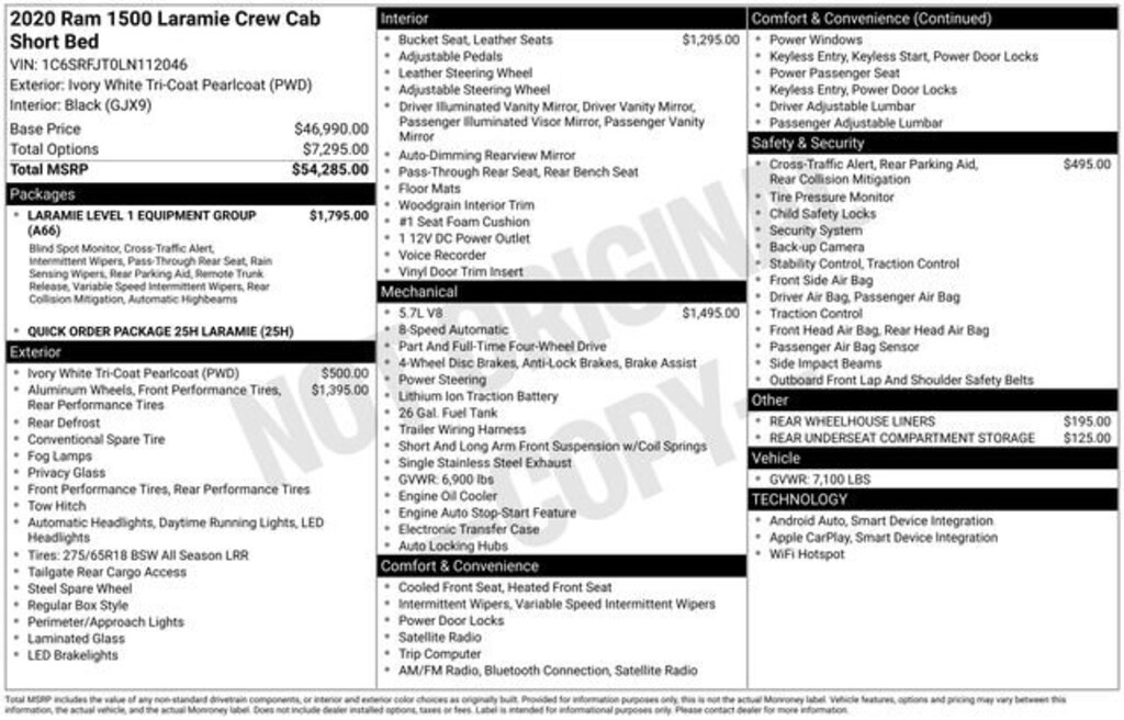 We Buy cars- Fast, Fair and Easy This 2020 Ivory White Tri-Coat Pearlcoat Ram 1500 Laramie 4WD is well equipped and includes these features and benefits: Laramie Level 1 Equipment Group, Quick Order Package 25H Laramie, #1 Seat Foam Cushion, 10 Speakers, 3 Rear Seat Head Restraints, 3.21 Rear Axle Ratio, 4 Way Front Headrests, 4-Wheel Disc Brakes, 48V Belt Starter Generator, 8.4 Touchscreen Display, ABS brakes, Adjustable pedals, Air Conditioning, Alloy wheels, AM/FM radio: SiriusXM, Apple CarPlay, Apple CarPlay/Android Auto, Audio memory, Auto-dimming door mirrors, Auto-dimming Rear-View mirror, Automatic temperature control, Brake assist, Bumpers: chrome, Compass, Delay-off headlights, Driver door bin, Driver Seat Memory, Driver vanity mirror, Dual front impact airbags, Dual front side impact airbags, Electronic Stability Control, Front anti-roll bar, Front Center Armrest w/Storage, Front dual zone A/C, Front fog lights, Front reading lights, Front Seat Back Map Pockets, Front wheel independent suspension, Fully automatic headlights, Garage door transmitter, Google Android Auto, GPS Antenna Input, Heated door mirrors, Heated Front Seats, Heated front seats, Heated Steering Wheel, Heated steering wheel, Illuminated entry, Integrated Center Stack Radio, Leather steering wheel, Leather Trim 40/20/40 Bench Seat, Low tire pressure warning, Memory seat, Occupant sensing airbag, Outside temperature display, Overhead airbag, Overhead console, Panic alarm, ParkSense Front/Rear Park Assist w/Stop (DISC), ParkView Rear Back-Up Camera, Passenger door bin, Passenger vanity mirror, Pedal memory, Power 4-Way Driver Lumbar Adjust, Power 4-Way Passenger Lumbar Adjust, Power 8-Way Driver & Passenger Seats, Power door mirrors, Power driver seat, Power passenger seat, Power steering, Power windows, Radio data system, Radio: Uconnect 4 w/8.4 Display, Rear anti-roll bar, Rear seat center armrest, Rear step bumper, Rear Underseat Compartment Storage, Rear Wheelhouse Liners, Rear window defroster, Remote keyless entry, Security system, SiriusXM Satellite Radio, Speed control, Split folding rear seat, Steering wheel mounted audio controls, Tachometer, Telescoping steering wheel, Tilt steering wheel, Traction control, Trip computer, Turn signal indicator mirrors, Variably intermittent wipers, Ventilated Front Seats, Ventilated front seats, Voltmeter, Wheels: 18 x 8 Aluminum Base Painted, and Wheels: 20 x 9 Premium Paint/Polished.