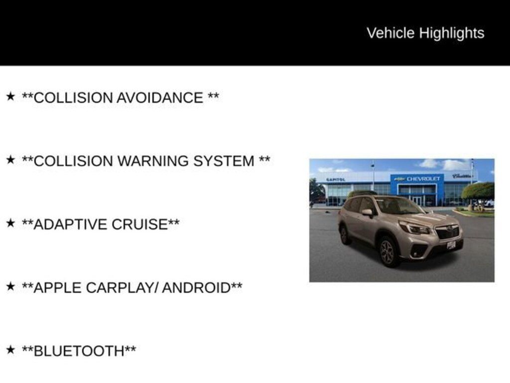 We Buy cars- Fast, Fair and Easy This 2021 Ice Silver Metallic Subaru Forester Premium AWD is well equipped and includes these features and benefits: Standard Model, 3.70 Axle Ratio, 4-Wheel Disc Brakes, 6 Speakers, ABS brakes, Air Conditioning, Alloy wheels, AM/FM radio: SiriusXM, Auto High-beam Headlights, Automatic temperature control, Brake assist, Bumpers: body-color, CD player, Cloth Upholstery, Driver door bin, Driver vanity mirror, Dual front impact airbags, Dual front side impact airbags, Electronic Stability Control, Emergency communication system: STARLINK Safety and Security (Subscription Required), Exterior Parking Camera Rear, Four wheel independent suspension, Front anti-roll bar, Front Bucket Seats, Front Center Armrest, Front fog lights, Front reading lights, Fully automatic headlights, Heated door mirrors, Heated Front Bucket Seats, Heated front seats, Illuminated entry, Knee airbag, Low tire pressure warning, Occupant sensing airbag, Outside temperature display, Overhead airbag, Overhead console, Panic alarm, Passenger door bin, Passenger vanity mirror, Power door mirrors, Power driver seat, Power moonroof: Panoramic, Power steering, Power windows, Radio data system, Radio: Subaru Starlink 6.5 Multimedia Plus System, Rear anti-roll bar, Rear seat center armrest, Rear window defroster, Rear window wiper, Remote keyless entry, Roof rack: rails only, Security system, Speed control, Speed-sensing steering, Split folding rear seat, Spoiler, STARLINK/Apple CarPlay/Android Auto, Steering wheel mounted audio controls, Tachometer, Telescoping steering wheel, Tilt steering wheel, Traction control, Trip computer, Variably intermittent wipers, and Wheels: 17 x 7.0J Black Machine Finish Alloy.