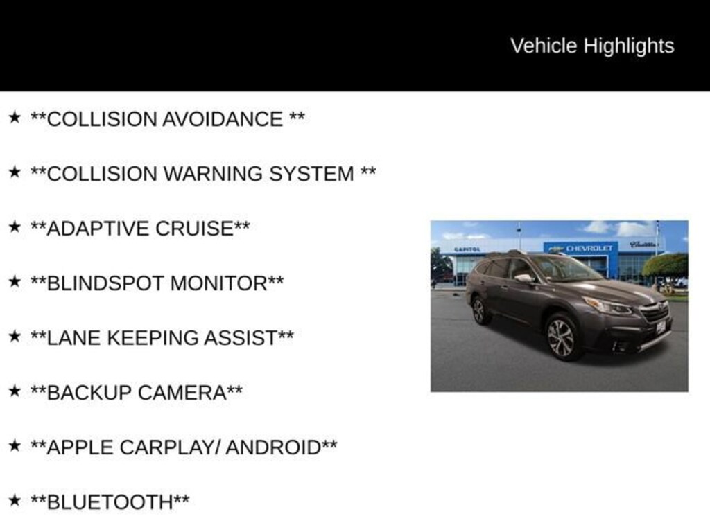 We Buy cars- Fast, Fair and Easy This 2022 Magnetite Gray Metallic Subaru Outback Touring XT AWD is well equipped and includes these features and benefits: Standard Model, 12 Speakers, 4-Wheel Disc Brakes, 4.111 Axle Ratio, ABS brakes, Air Conditioning, All-Weather Floor Liners, Alloy wheels, AM/FM radio: SiriusXM, Auto High-beam Headlights, Auto-Dimming Exterior Mirror w/Approach Light, Auto-dimming Rear-View mirror, Automatic temperature control, Brake assist, Bumpers: body-color, Compass, Dome Light LED Upgrade, Driver door bin, Driver vanity mirror, Dual front impact airbags, Dual front side impact airbags, Electronic Stability Control, Emergency communication system: STARLINK Safety and Security (Subscription Required), Exterior Parking Camera Rear, Four wheel independent suspension, Front anti-roll bar, Front Bucket Seats, Front Center Armrest w/Storage, Front dual zone A/C, Front fog lights, Front reading lights, Fully automatic headlights, Garage door transmitter: HomeLink, harman/kardon® Speakers, Heated & Ventilated Front Bucket Seats, Heated door mirrors, Heated front seats, Heated rear seats, Heated steering wheel, HVAC memory, Illuminated entry, Knee airbag, Leather steering wheel, Low tire pressure warning, Memory seat, Navigation System, Occupant sensing airbag, Outside temperature display, Overhead airbag, Overhead console, Panic alarm, Passenger door bin, Passenger vanity mirror, Perforated Nappa Leather-Trimmed Upholstery, Power door mirrors, Power driver seat, Power Liftgate, Power moonroof, Power passenger seat, Power steering, Power windows, Radio: Subaru STARLINK 11.6 Multimedia Nav System, Rear anti-roll bar, Rear Bumper Cover, Rear Seat Back Protector, Rear seat center armrest, Rear window defroster, Rear window wiper, Remote CD player, Remote keyless entry, Roof rack, Security system, Speed control, Speed-sensing steering, Split folding rear seat, Spoiler, STARLINK/Apple CarPlay/Android Auto, Steering wheel mounted audio controls, Steering Wheel Paddle Shift Control Switches, Tachometer, Telescoping steering wheel, Tilt steering wheel, Traction control, Trip computer, Turn signal indicator mirrors, Variably intermittent wipers, Ventilated front seats, and Wheels: 18 x 7J Black Aluminum Alloy.