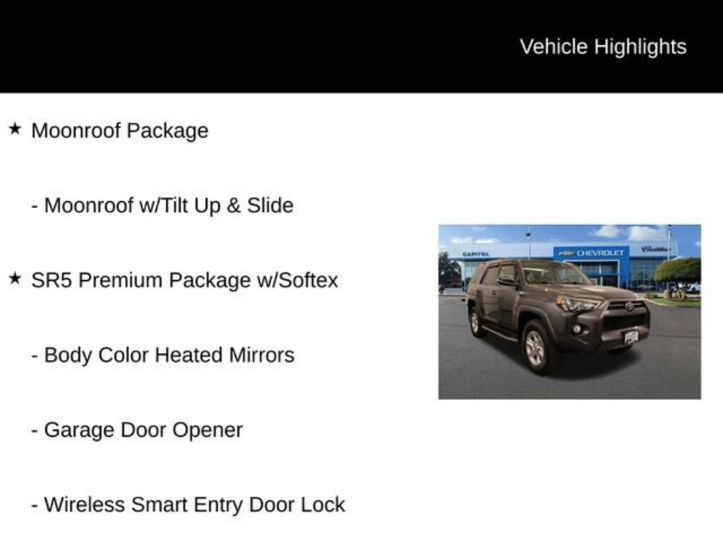 We Buy cars- Fast, Fair and Easy This 2020 Gray Toyota 4Runner SR5 Premium 4WD is well equipped and includes these features and benefits: Moonroof Package (Moonroof w/Tilt Up & Slide), SR5 Premium Package w/Softex (Body Color Heated Mirrors, Garage Door Opener, and Wireless Smart Entry Door Lock), 17 x 7.0 6-Spoke Alloy Wheels, ABS brakes, Active Cruise Control, Alloy wheels, Compass, Electronic Stability Control, Heated door mirrors, Heated Front Bucket Seats, Heated front seats, Illuminated entry, Low tire pressure warning, Navigation System, Remote keyless entry, Traction control, 3.727 Axle Ratio, 4-Wheel Disc Brakes, 8 Speakers, Air Conditioning, AM/FM radio: SiriusXM, Anti-whiplash front head restraints, Apple CarPlay/Android Auto, Auto High-beam Headlights, Auto-dimming Rear-View mirror, Brake assist, Bumpers: body-color, Driver door bin, Driver vanity mirror, Dual front impact airbags, Dual front side impact airbags, Emergency communication system: Safety Connect with 1-year trial, Exterior Parking Camera Rear, Front anti-roll bar, Front Bucket Seats, Front Center Armrest, Front fog lights, Front reading lights, Front wheel independent suspension, Garage door transmitter: HomeLink, Knee airbag, Leather Shift Knob, Leather steering wheel, Occupant sensing airbag, Outside temperature display, Overhead airbag, Overhead console, Panic alarm, Passenger door bin, Passenger vanity mirror, Power door mirrors, Power driver seat, Power passenger seat, Power steering, Power windows, Radio: Premium Audio w/Dynamic Navigation, Rear anti-roll bar, Rear seat center armrest, Rear window defroster, Rear window wiper, Roof rack: rails only, Security system, Softex Synthetic Leather Seat Trim, Speed control, Speed-sensing steering, Split folding rear seat, Spoiler, Steering wheel mounted audio controls, Tachometer, Telescoping steering wheel, Tilt steering wheel, Trip computer, Turn signal indicator mirrors, and Variably intermittent wipers.
