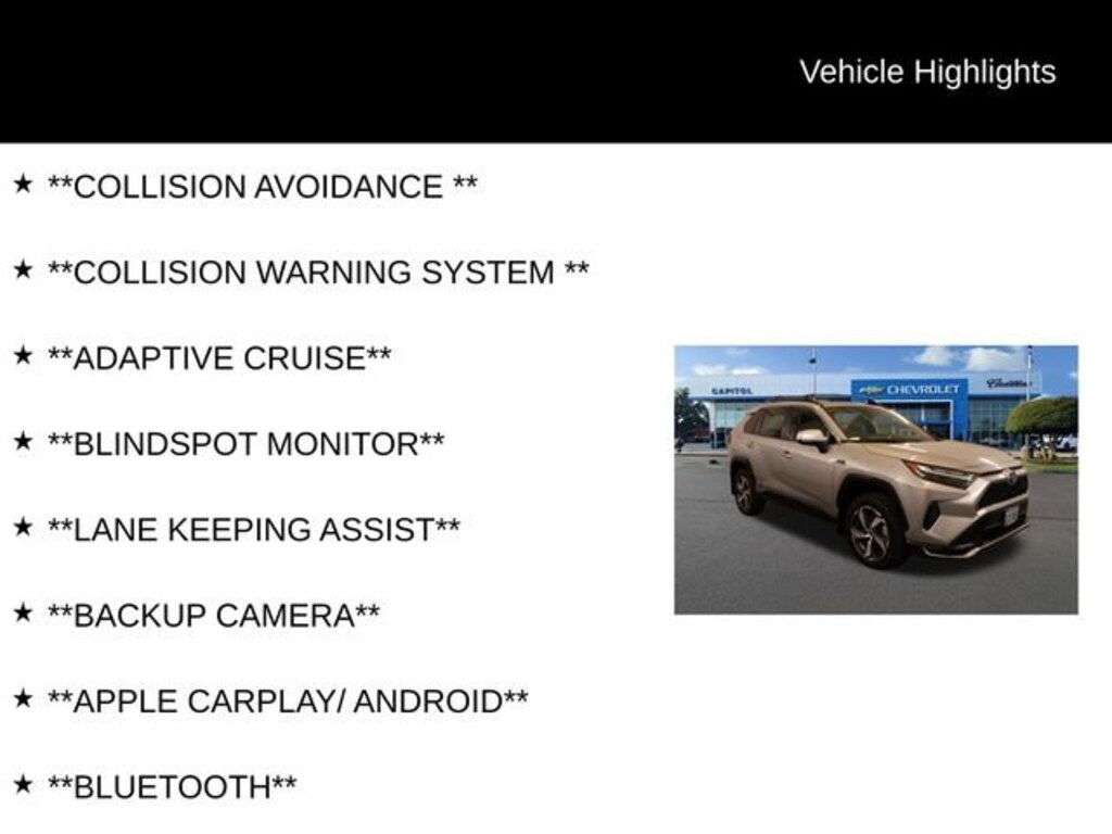 We Buy cars- Fast, Fair and Easy This 2022 Silver Sky Metallic Toyota RAV4 Prime SE AWD is well equipped and includes these features and benefits: Weather & Moonroof Package (3-Spoke Heated Leather Steering Wheel, Heated Rear Outboard Seats, Rain Sensing Wipers w/De-Icer Function, and Tilt & Slide Moonroof), 18 Alloy Wheels, 4-Wheel Disc Brakes, 6 Speakers, ABS brakes, Air Conditioning, Alloy wheels, AM/FM radio: SiriusXM, Apple CarPlay/Android Auto, Auto High-beam Headlights, Automatic temperature control, Axle Ratio: TBD, Brake assist, Bumpers: body-color, Delay-off headlights, Driver door bin, Driver vanity mirror, Dual front impact airbags, Dual front side impact airbags, Electronic Stability Control, Emergency communication system: Safety Connect with 1-year trial, Exterior Parking Camera Rear, Fabric Seat Trim (FA), Four wheel independent suspension, Front anti-roll bar, Front Bucket Seats, Front Center Armrest, Front dual zone A/C, Front reading lights, Fully automatic headlights, Heated door mirrors, Heated front seats, Heated Front Sport Seats, Illuminated entry, Knee airbag, Leather Shift Knob, Low tire pressure warning, Occupant sensing airbag, Outside temperature display, Overhead airbag, Overhead console, Panic alarm, Passenger door bin, Passenger vanity mirror, Power door mirrors, Power driver seat, Power Liftgate, Power steering, Power windows, Radio data system, Radio: Audio, Rear anti-roll bar, Rear seat center armrest, Rear window defroster, Rear window wiper, Remote keyless entry, Roof rack: rails only, Speed control, Speed-sensing steering, Split folding rear seat, Spoiler, Steering wheel mounted audio controls, Telescoping steering wheel, Tilt steering wheel, Traction control, Trip computer, Turn signal indicator mirrors, and Variably intermittent wipers.