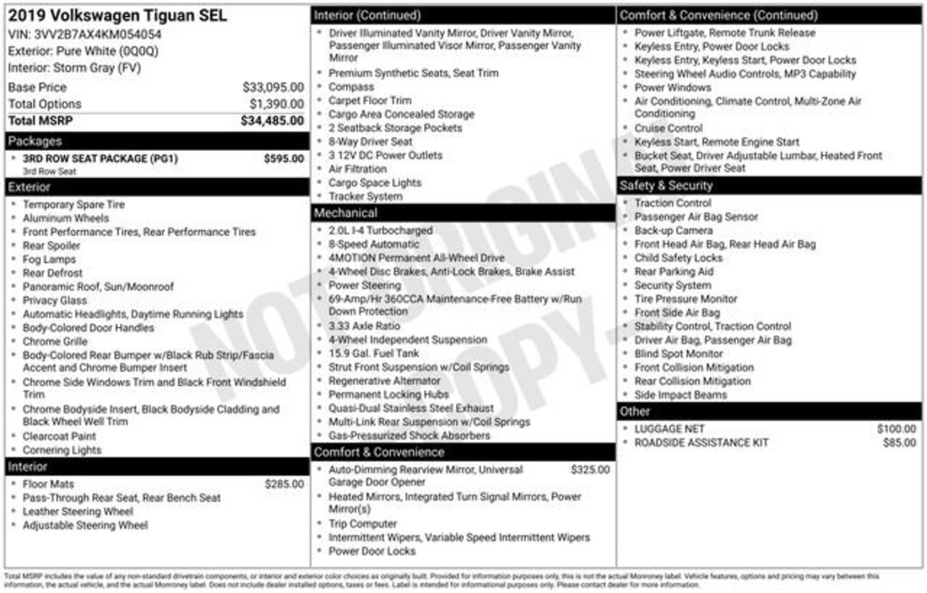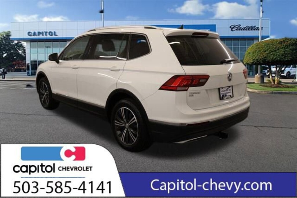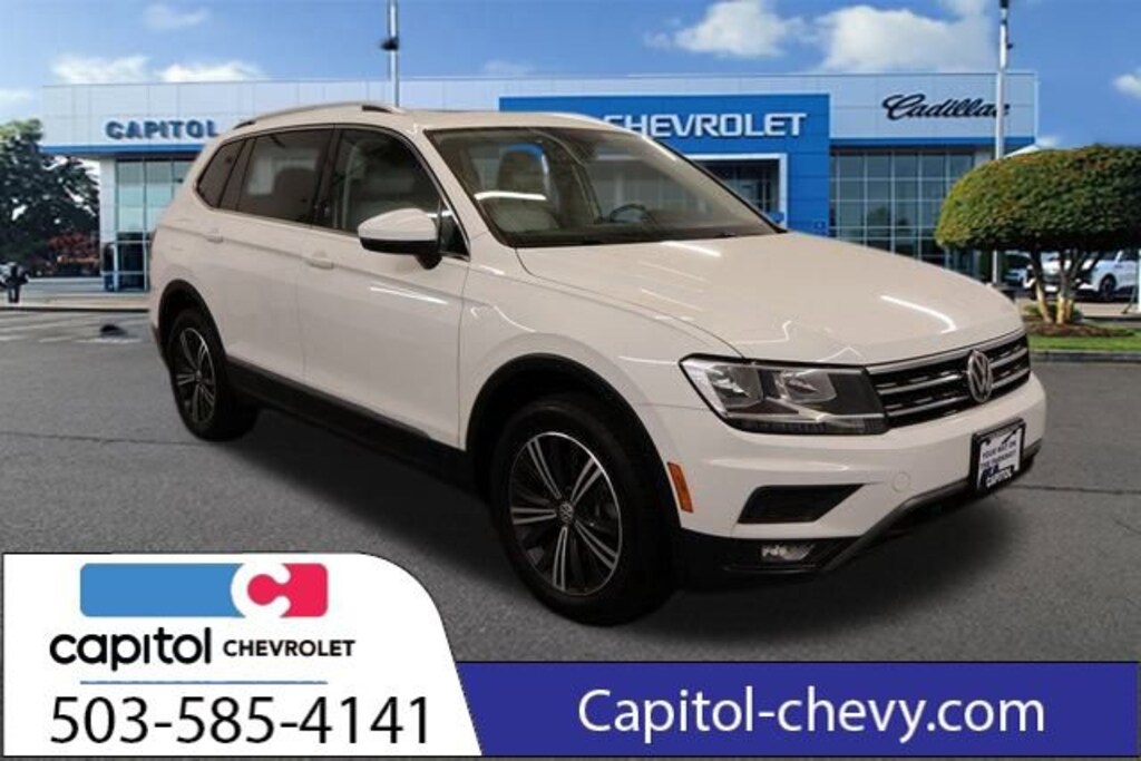 We Buy cars- Fast, Fair and Easy This 2019 Pure White Volkswagen Tiguan 2.0T SEL AWD is well equipped and includes these features and benefits: 3rd Row Seat Package, 3-Row Rubber Mats Kit (DISC), 3.33 Axle Ratio, 4-Wheel Disc Brakes, 4-Wheel Independent Suspension, 6 Speakers, ABS brakes, Air Conditioning, Alloy wheels, AM/FM radio: SiriusXM, Automatic temperature control, Brake assist, Bumpers: body-color, Compass, Delay-off headlights, Driver door bin, Driver vanity mirror, Dual front impact airbags, Dual front side impact airbags, Electronic Stability Control, Emergency communication system: VW Car-Net services (capabilities require enrollment or subscription), Exterior Parking Camera Rear, Forward collision: FCW w/Autonomous Emergency Braking mitigation, Four wheel independent suspension, Frameless Auto-Dimming Rearview Mirror, Front anti-roll bar, Front Bucket Seats, Front Center Armrest, Front dual zone A/C, Front fog lights, Front reading lights, Fully automatic headlights, Heated door mirrors, Heated Front Comfort Seats, Heated front seats, Heavy Duty Trunk Liner w/VW CarGo Blocks, Illuminated entry, Leather Shift Knob, Low tire pressure warning, Luggage Net, Navigation System, Occupant sensing airbag, Outside temperature display, Overhead airbag, Overhead console, Panic alarm, Passenger door bin, Passenger vanity mirror, Perforated V-Tex Leatherette Seating Surfaces, Power door mirrors, Power driver seat, Power Liftgate, Power moonroof, Power steering, Power windows, Radio data system, Radio: Discover Media AM/FM/HD, Rear anti-roll bar, Rear reading lights, Rear seat center armrest, Rear window defroster, Rear window wiper, Remote CD player, Remote keyless entry, Roadside Assistance Kit, Roof rack: rails only, Security system, Speed control, Speed-sensing steering, Split folding rear seat, Spoiler, Steering wheel mounted audio controls, Tachometer, Telescoping steering wheel, Tilt steering wheel, Traction control, Trip computer, Turn signal indicator mirrors, Variably intermittent wipers, and Wheels: 18 Thin Multi-Spoke 2-Tone Alloy.